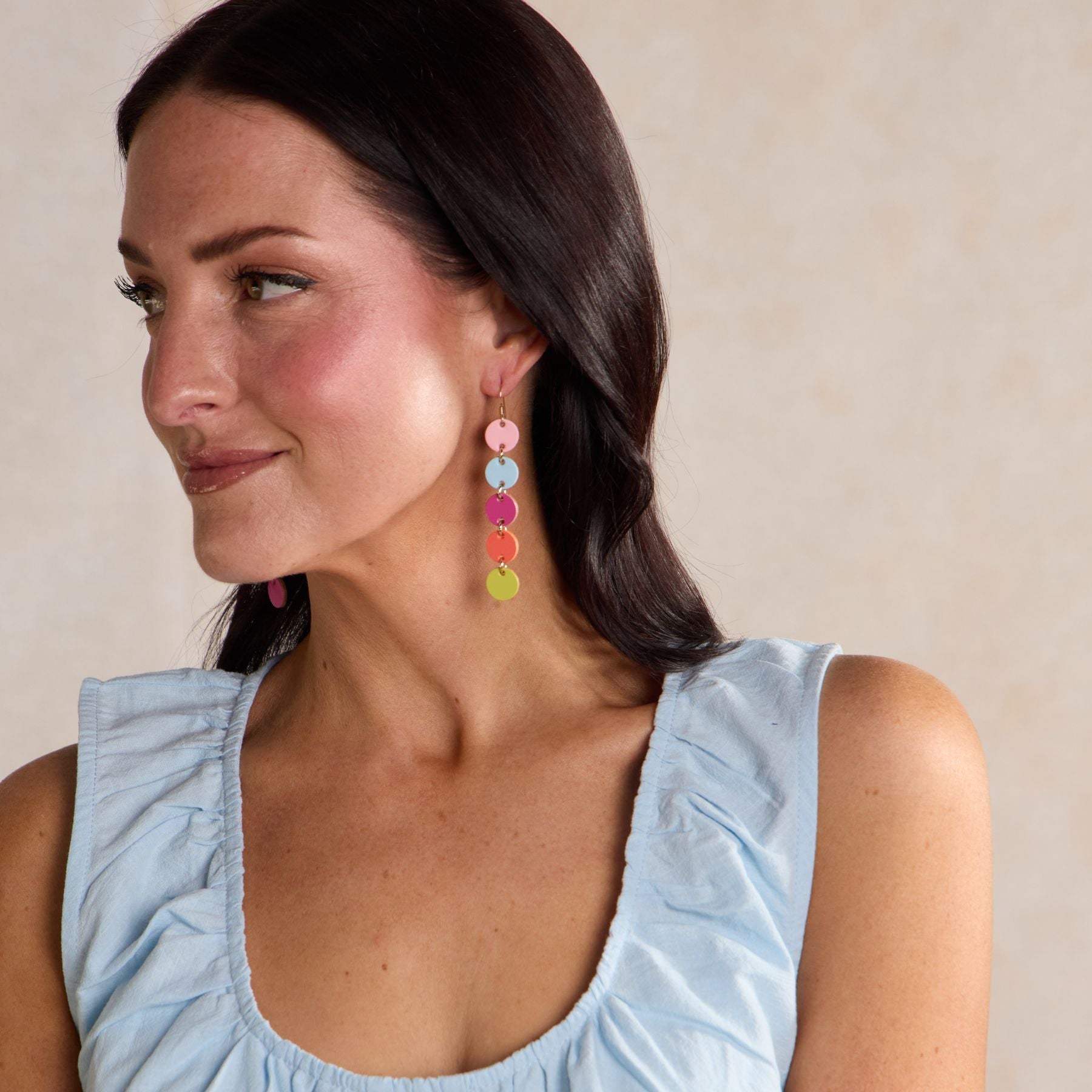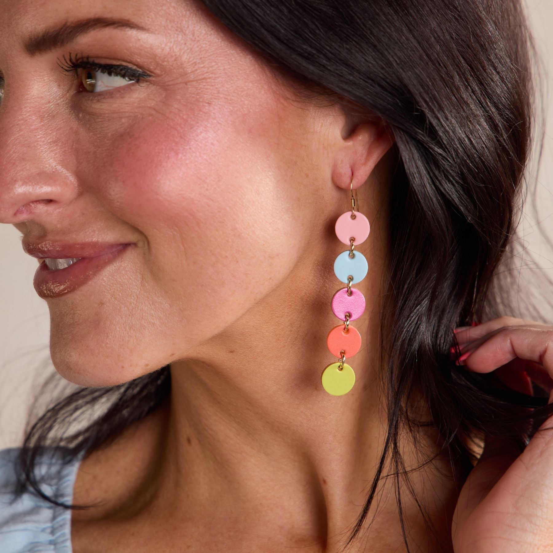 Made with a variety of our Sunrise, Chartreuse, Cameo, Robin, and Magenta Shimmer leathers, this lightweight asymmetrical earring has fun movement and color, allowing you to be unique and versatile with style.