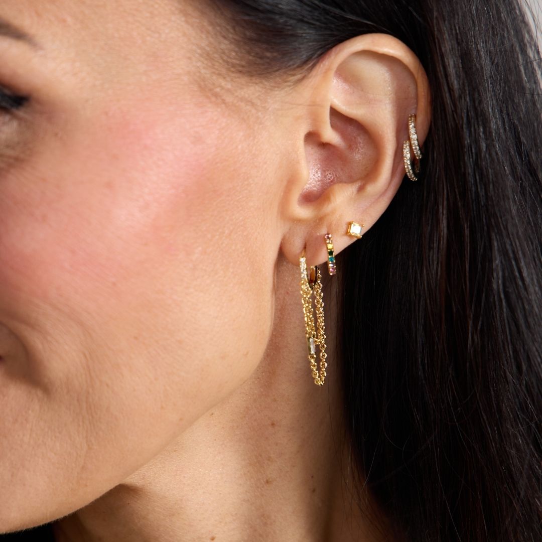 Amp up any ear stack with the Gold Thea Chain Huggies. Stack them to make a bold layered statement or keep it simple and create a unique edge. These huggies are crafted with 14k gold-plated hardware, looped chains and emerald cut glass stone accents. Let this timeless accessory speak volumes with your style.