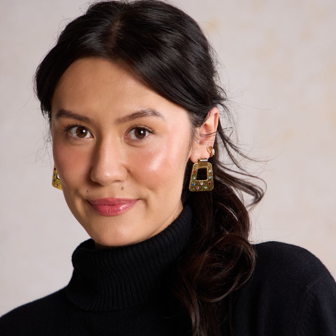 Timeless style meets a modern silhouette with the Avery earrings. This lightweight statement earring is created with our premium firm Vintage Gold leather with jeweled accents and a beveled gold or silver stud component.Â