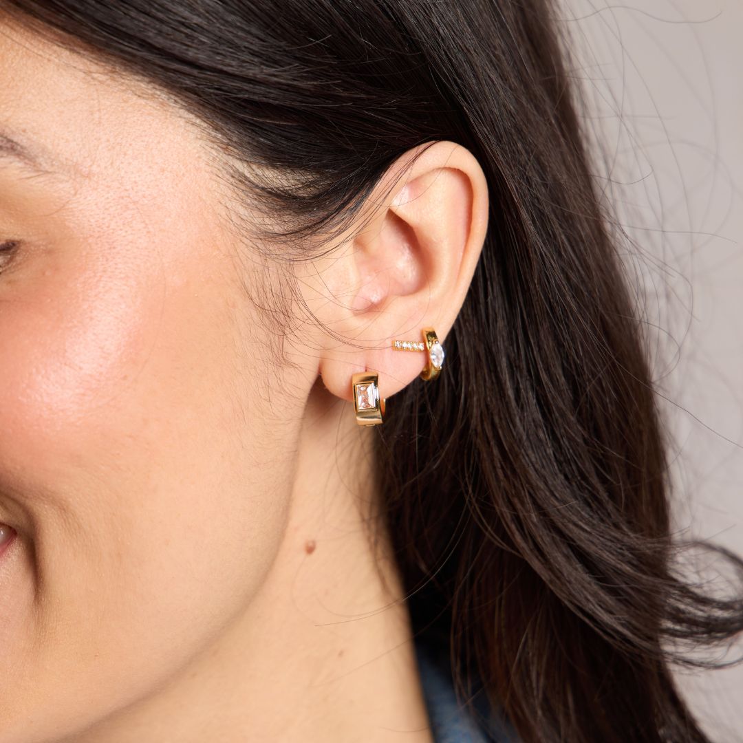 These rhodium-plated baguette bezel huggies feature vibrant baguette cut stone in a sleek bezel setting, perfect for everyday wear and effortless modern style. Wear them alone for a minimalist look or stack them for a stylish statement.