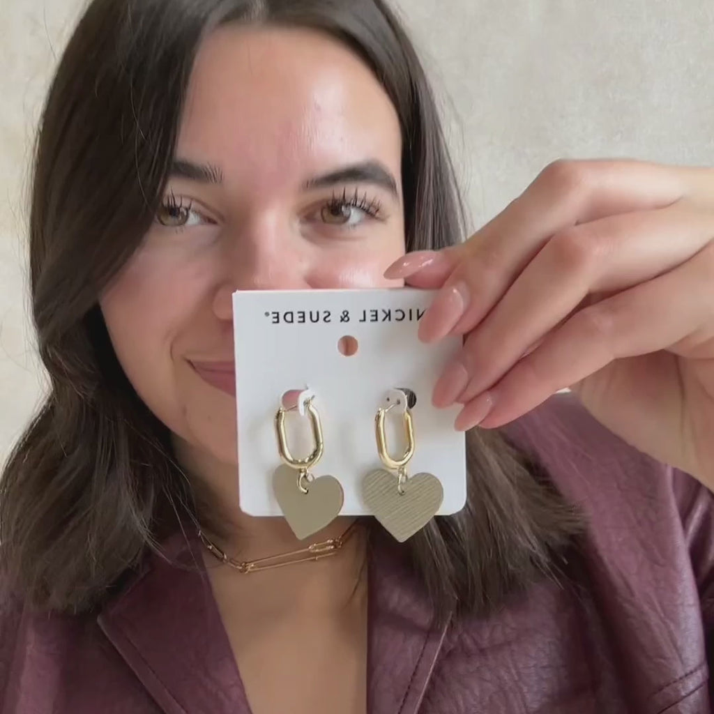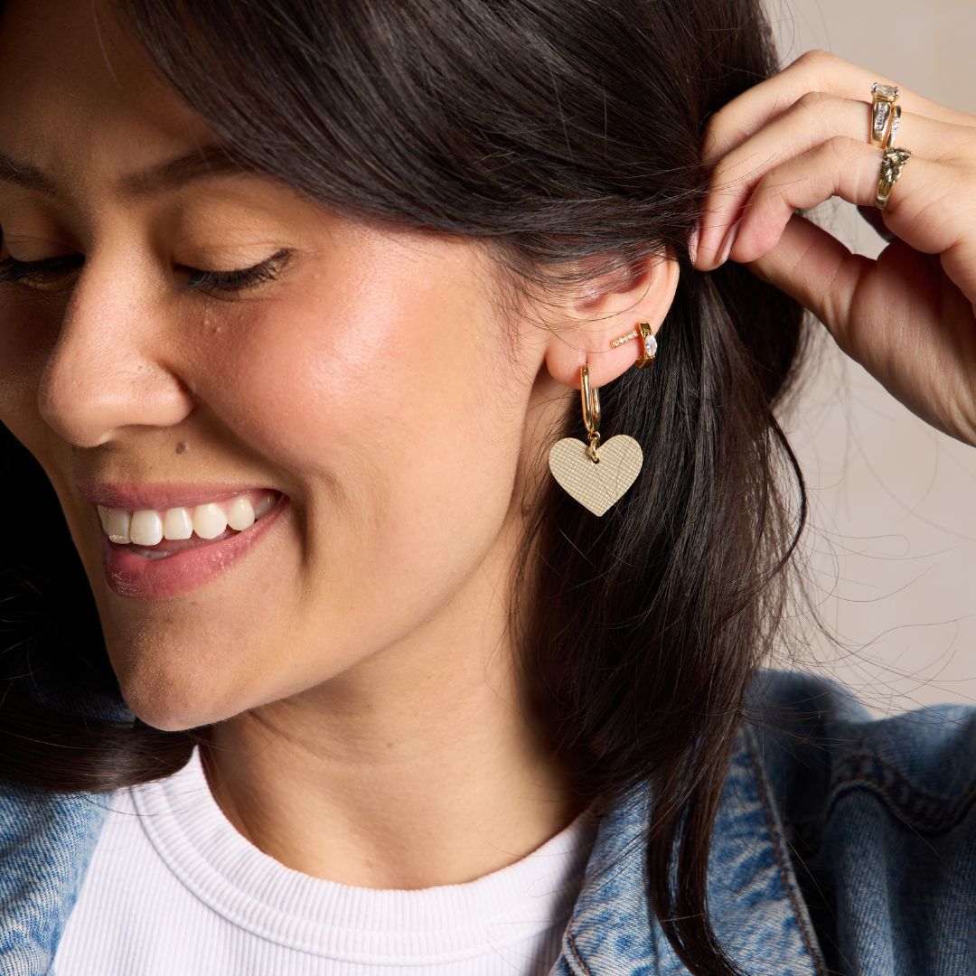 Make a neutral statement with the Luxe Linen Shimmer Quinn, featuring a lightweight leather heart on a huggie earring.Â