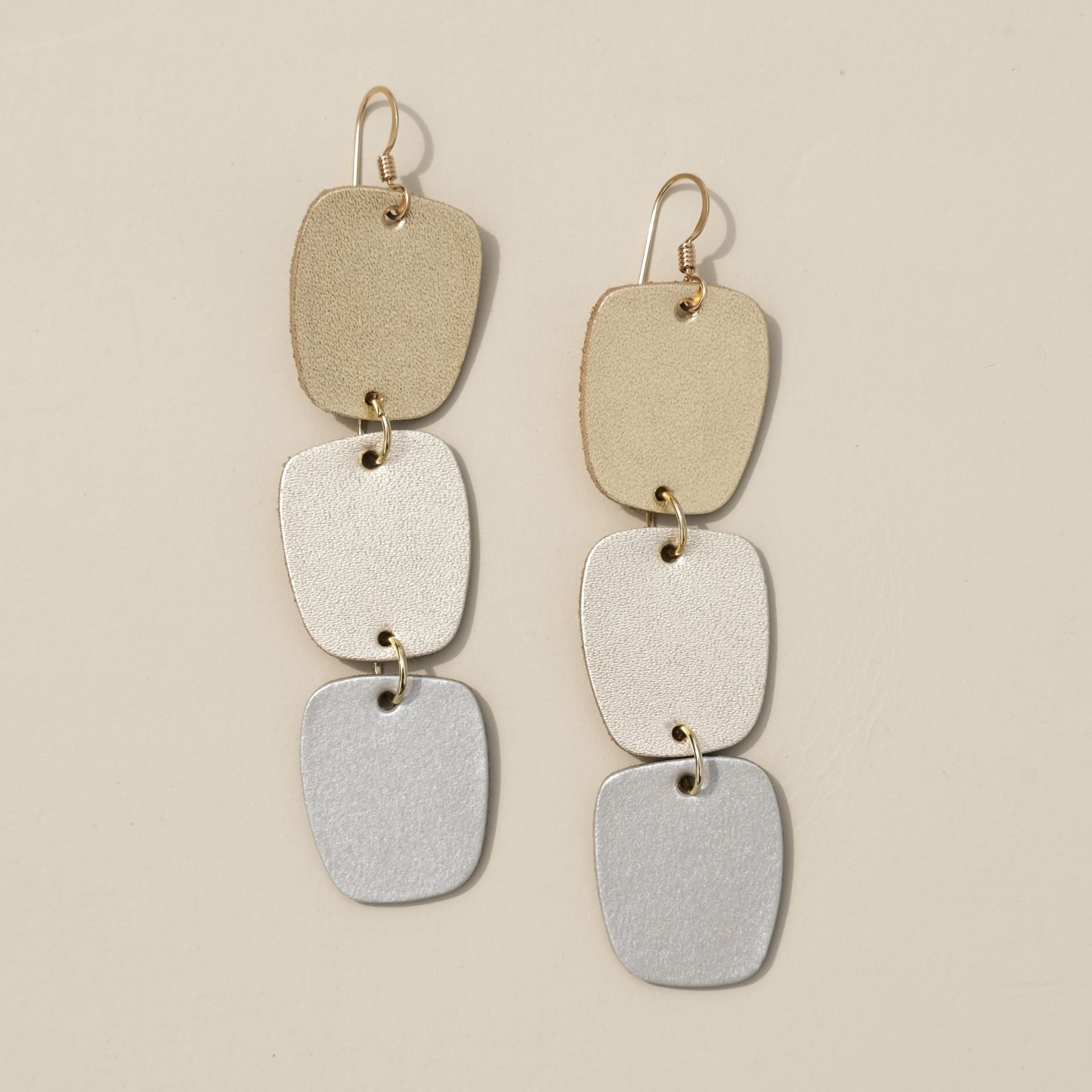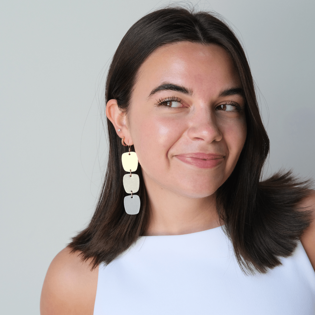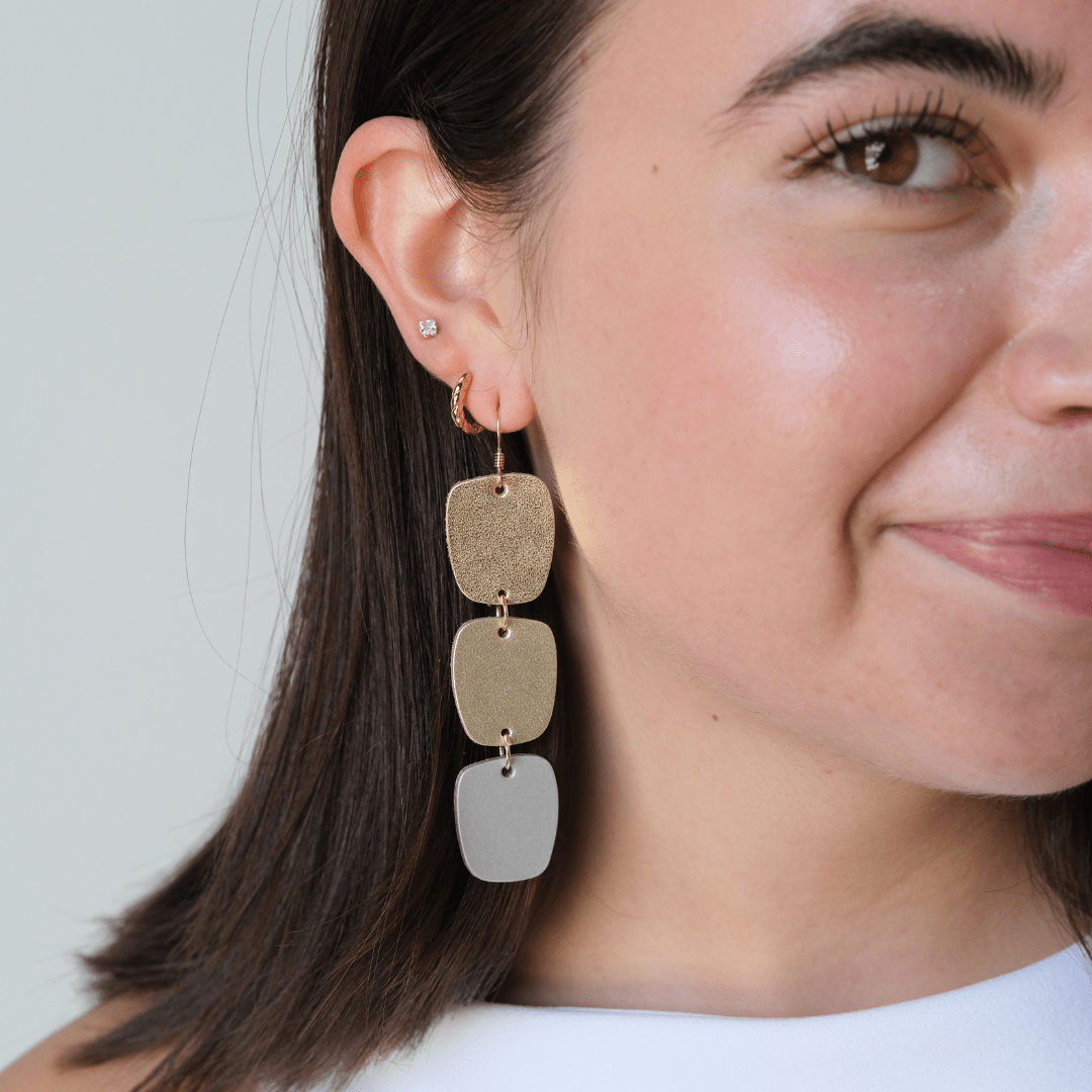 Meet your new golden hour statement go-to. The Metallic Ombré Cali earrings are crafted from three lightweight leathers - Gold Satin, Champagne Satin, and Silver Satin - for a mixed metal textured finish that brings all the shimmer without the weight.