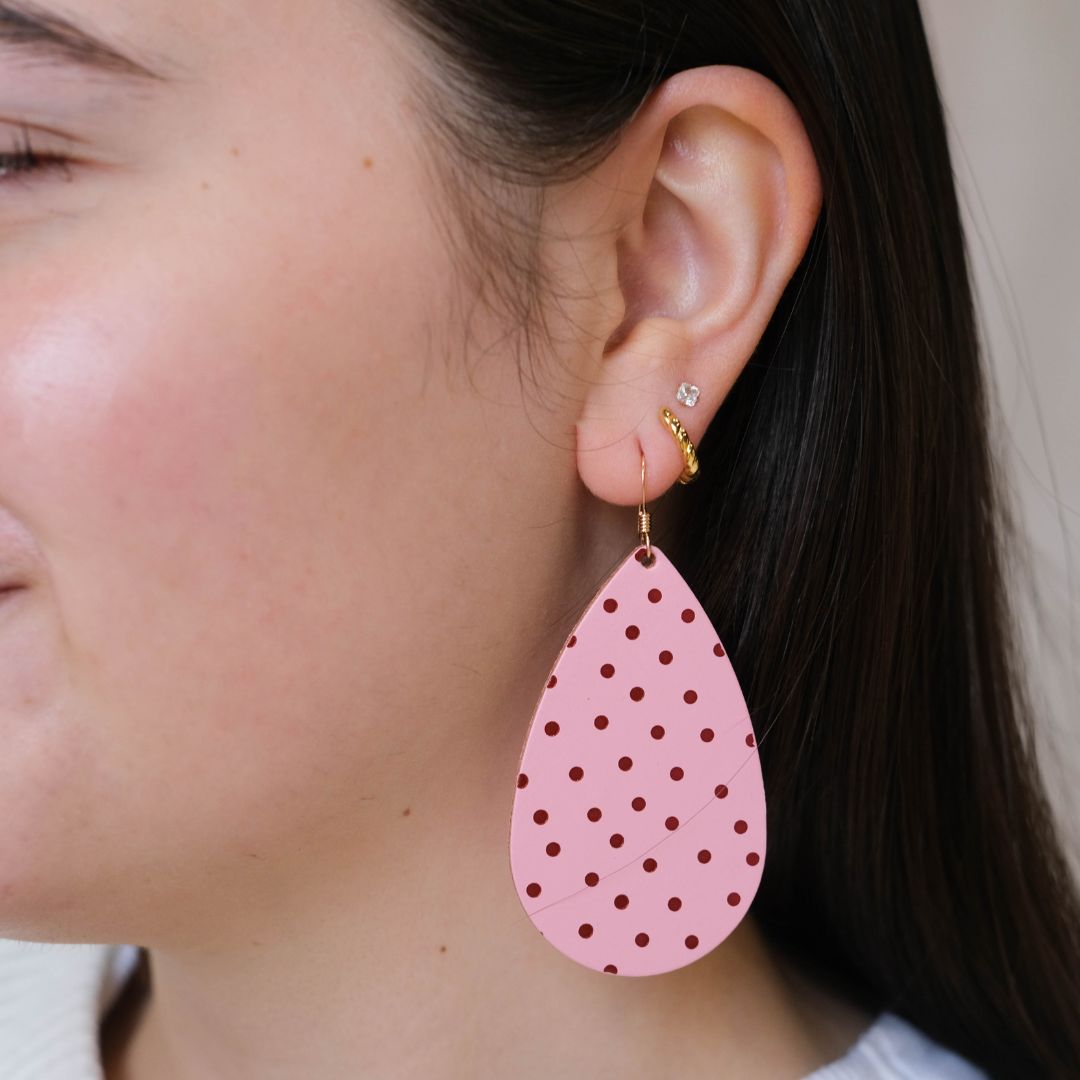 You'll have a sweet spot for the cameo polka dot teardrops. Featuring smooth cameo leather with embossed burgundy polka dots.