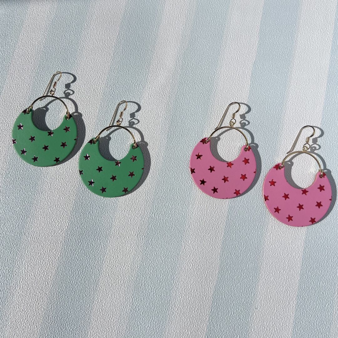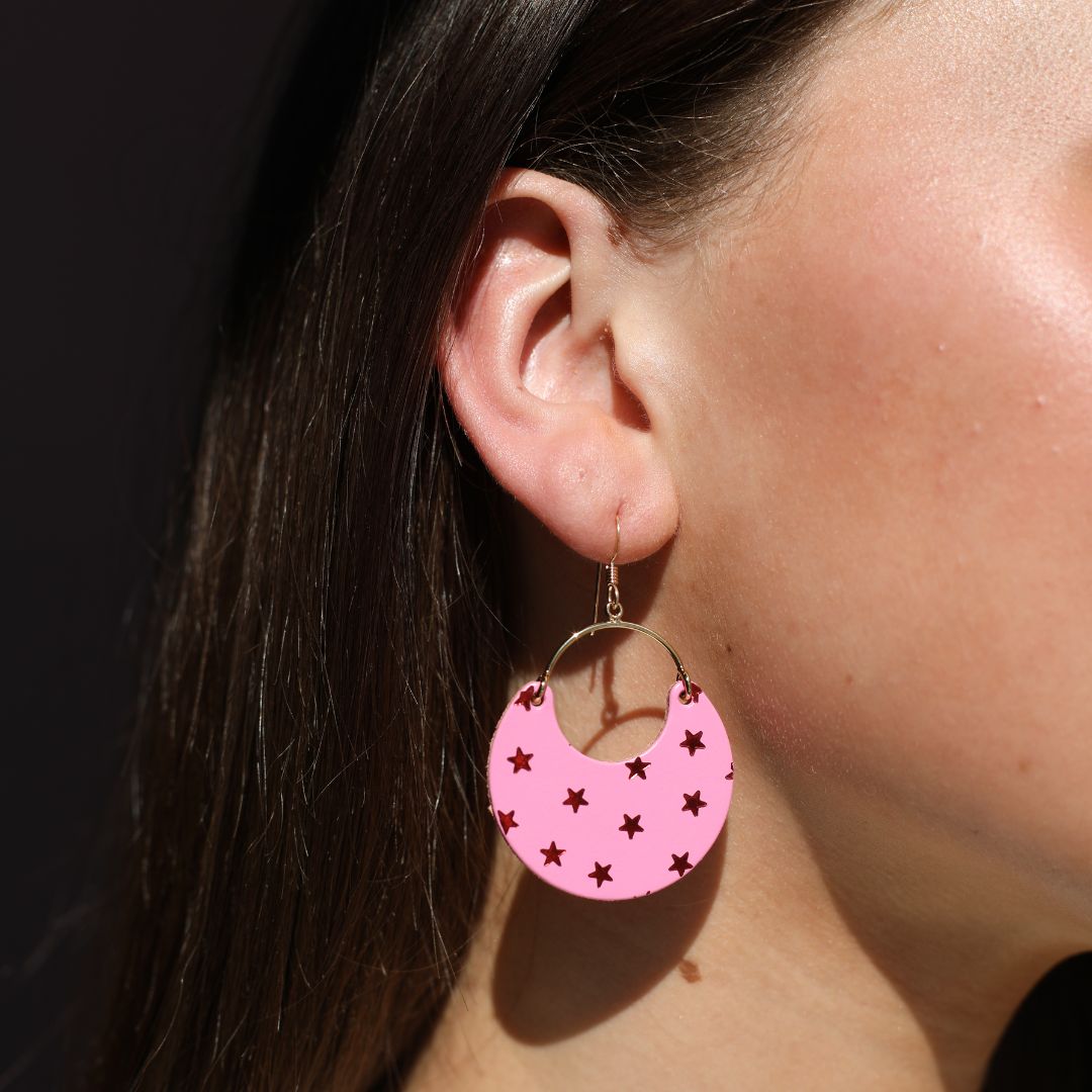 Celebrate in lucky style with these festive statement earrings. Handcrafted from our premium Dream House Pink leather, the Star Ninas feature a hand-stamped foil star pattern that adds just the right touch of sparkle.