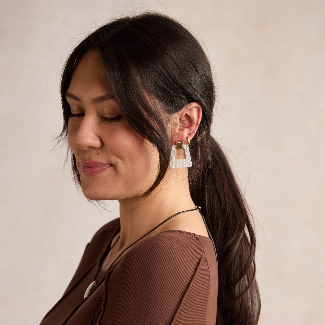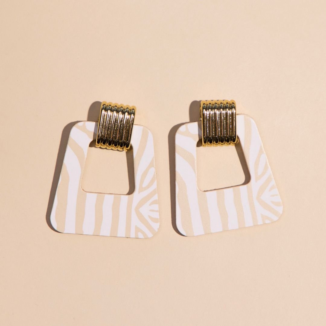 Timeless style meets a modern silhouette with the Avery earrings. This lightweight statement earring is created with our premium firm Ecru leather and white foiled zebra pattern, finished with a beveled gold or silver stud component.