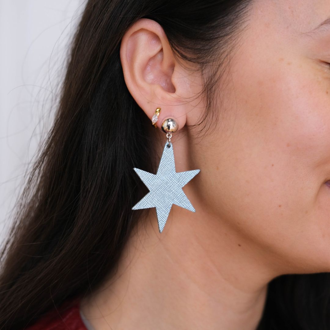 The Ice Blue Astrid features a star shape earring crafted from premium Italian leather, finished with a polished silver post stud—giving you a bold look and lightweight feel.
