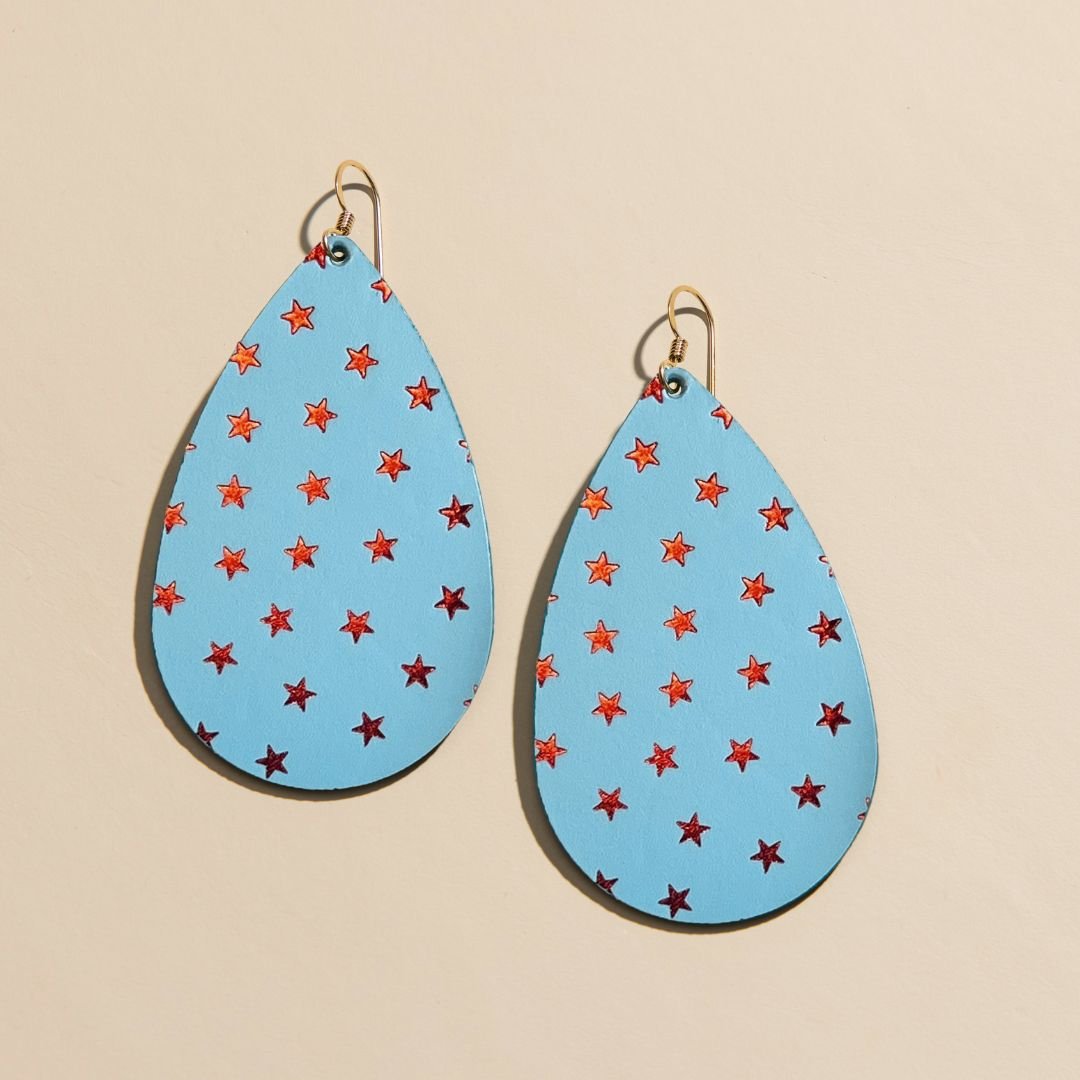 Celebrate in lucky style with these festive statement earrings. Handcrafted from our premium lagoon leather, the Lagoon Star Teardrops feature a hand-stamped foil star pattern that adds just the right touch of sparkle.