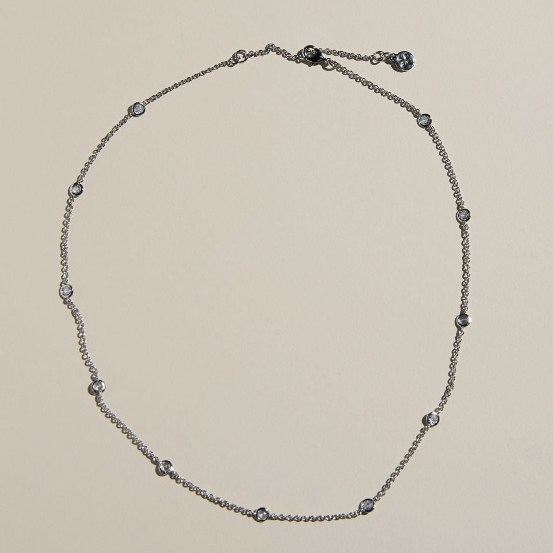 Dainty and minimalist, the CZ Delicate Saturn Chain Necklace is an interlinking station chain designed to delicately sit on your neckline. Upgrade your necklace stack with this rhodium-plated staple, show off your favorite attachable charms, or wear it alone for a timeless touch.