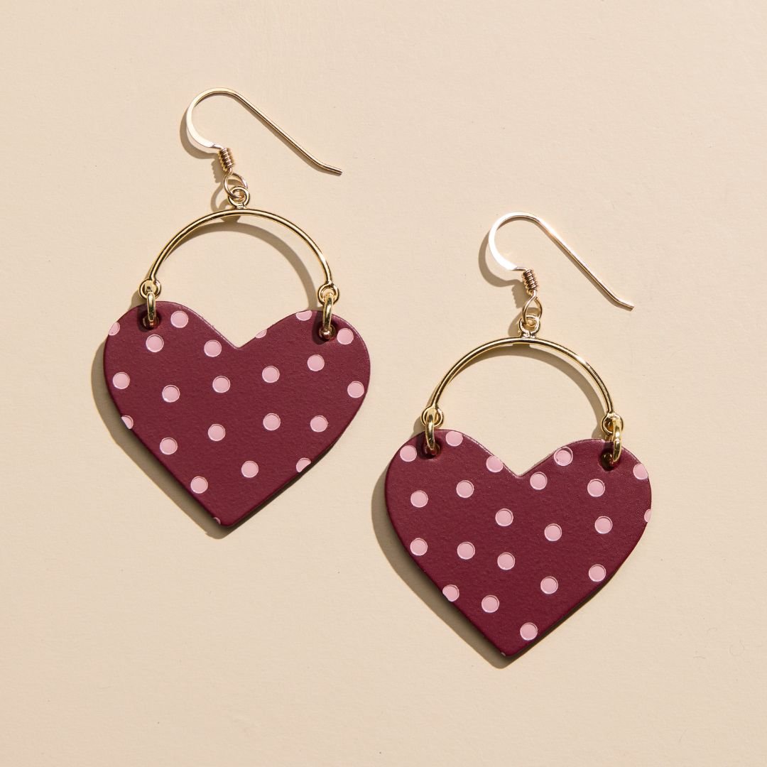 Make a statement of love and style with The Lover earrings. Featuring a bold, wide heart shape. Crafted with a handmade polka dot pattern over smooth burgundy leather, The Lover promises to elevate any outfit with its unique blend of romantic charm to add to your everyday look.