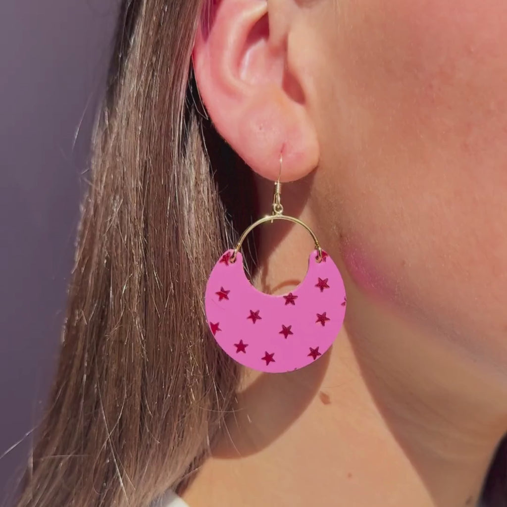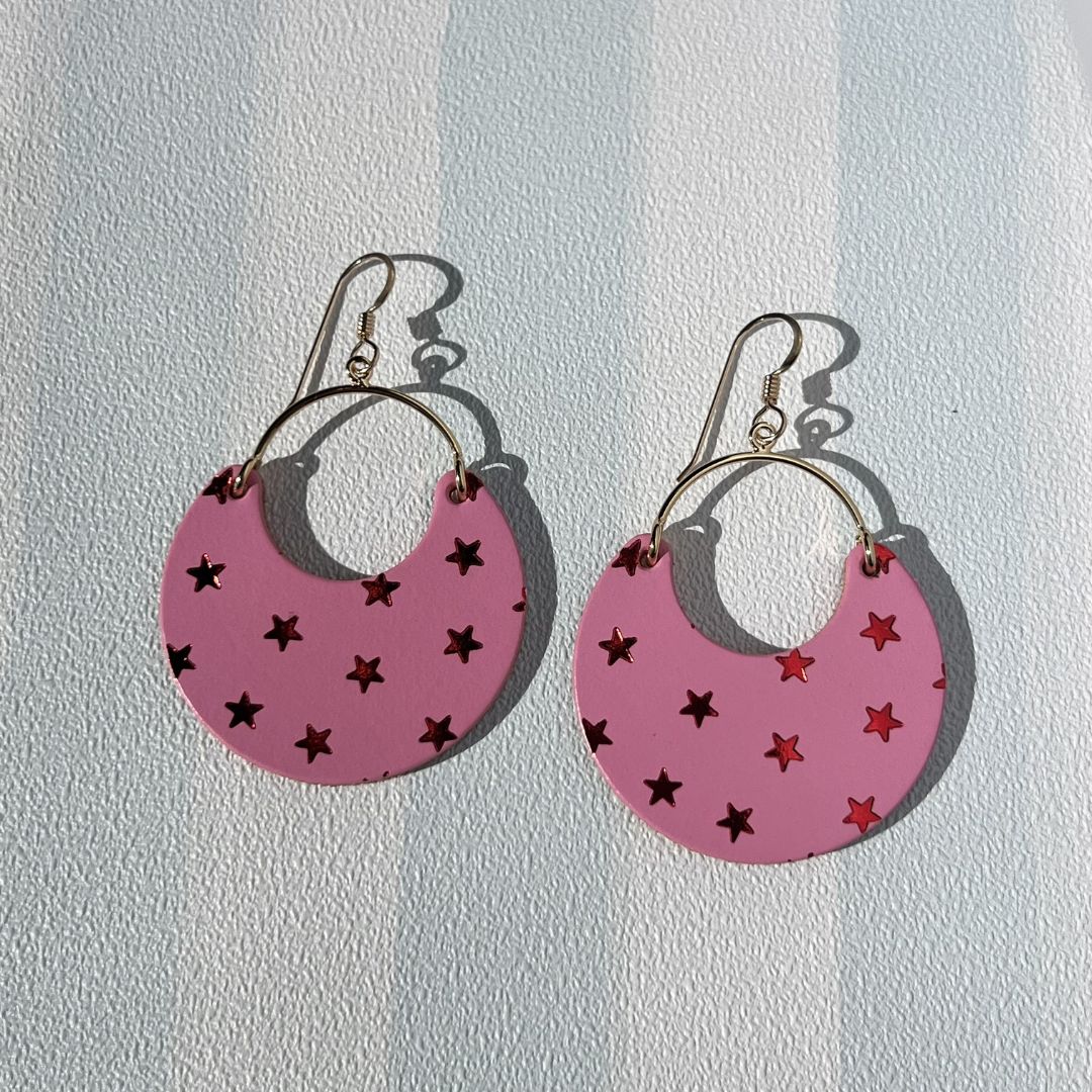 Celebrate in lucky style with these festive statement earrings. Handcrafted from our premium Dream House Pink leather, the Star Ninas feature a hand-stamped foil star pattern that adds just the right touch of sparkle.