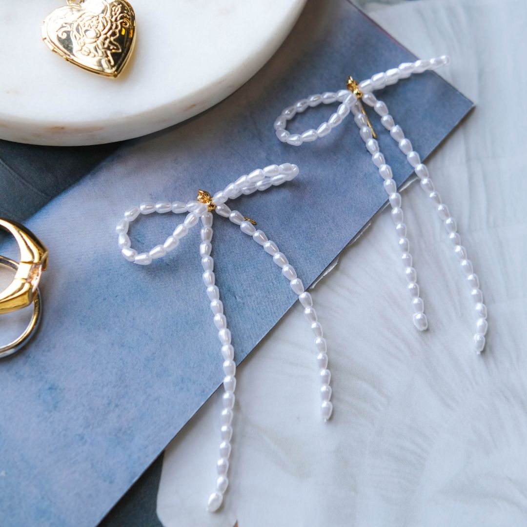 These elegant bow drop studs showcase a graceful cascade of lightweight delicate pearls creating a timeless look with effortless movement.