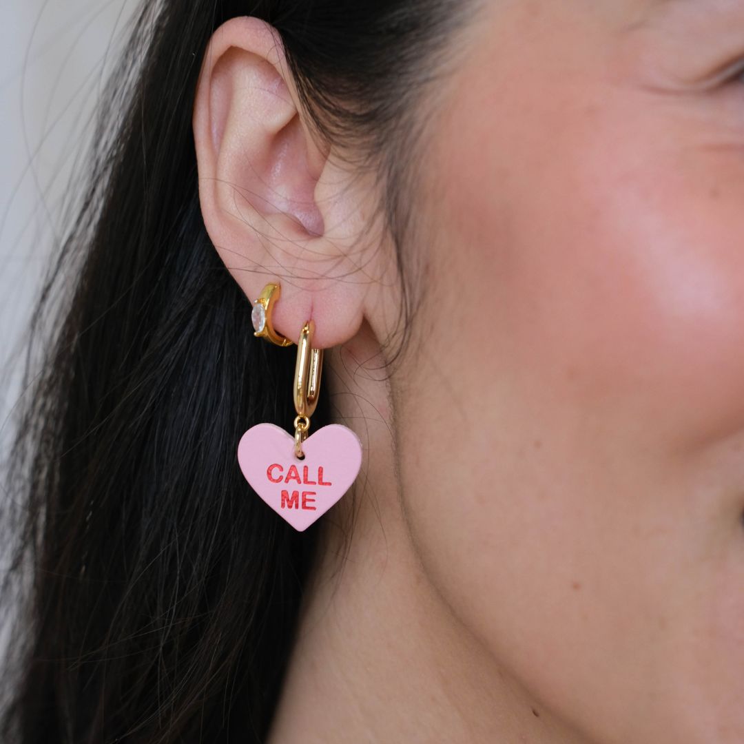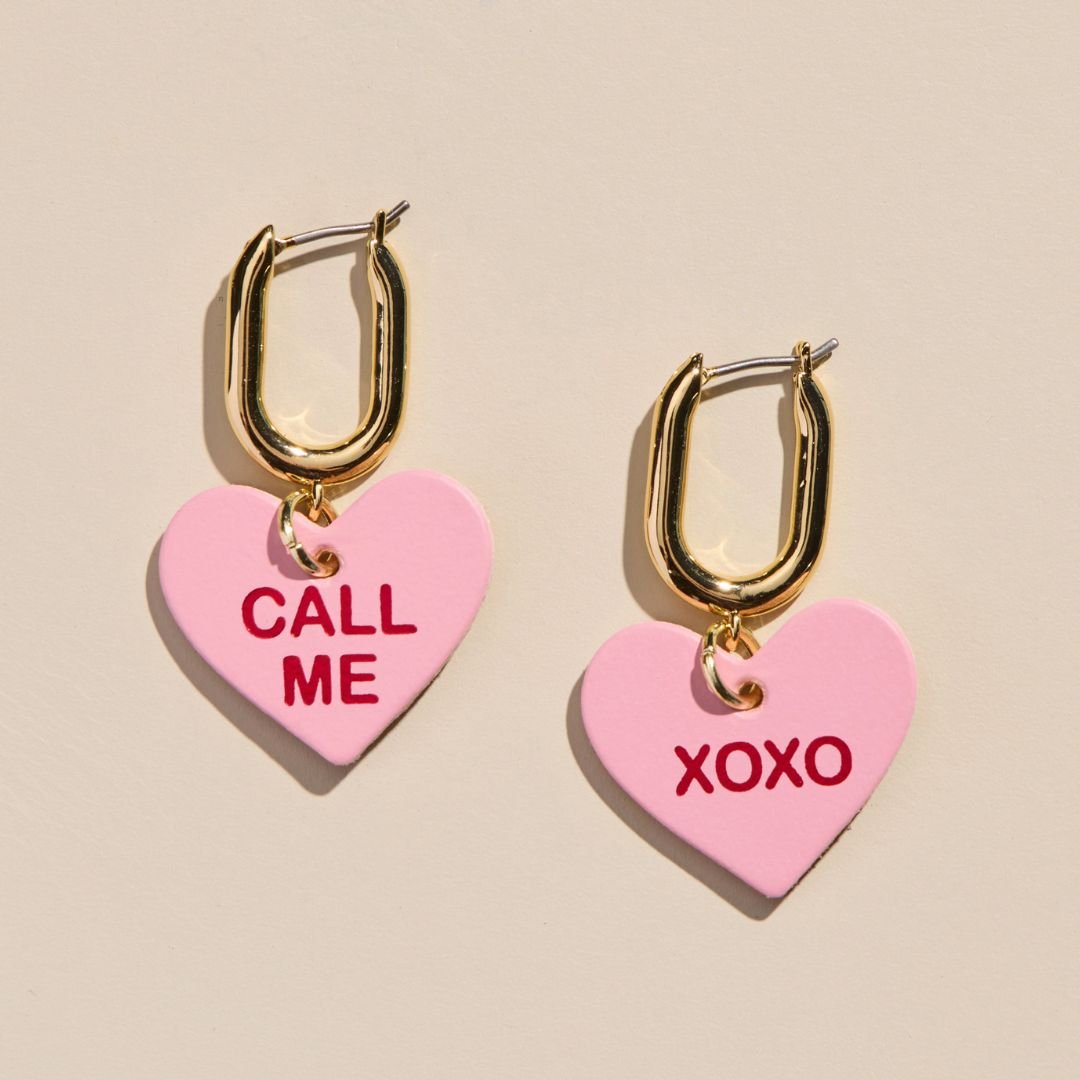The Conversation Heart Quinns are delicate, heart-shaped earrings, adorned with red hand-foiled messages, "Call Me" and "XOXO,". A perfect wearable statement.
