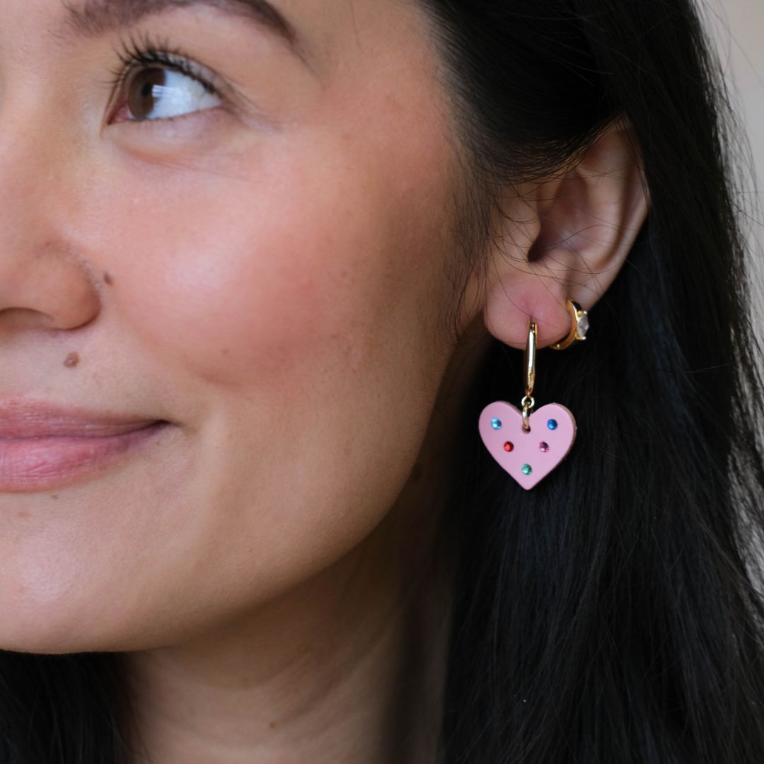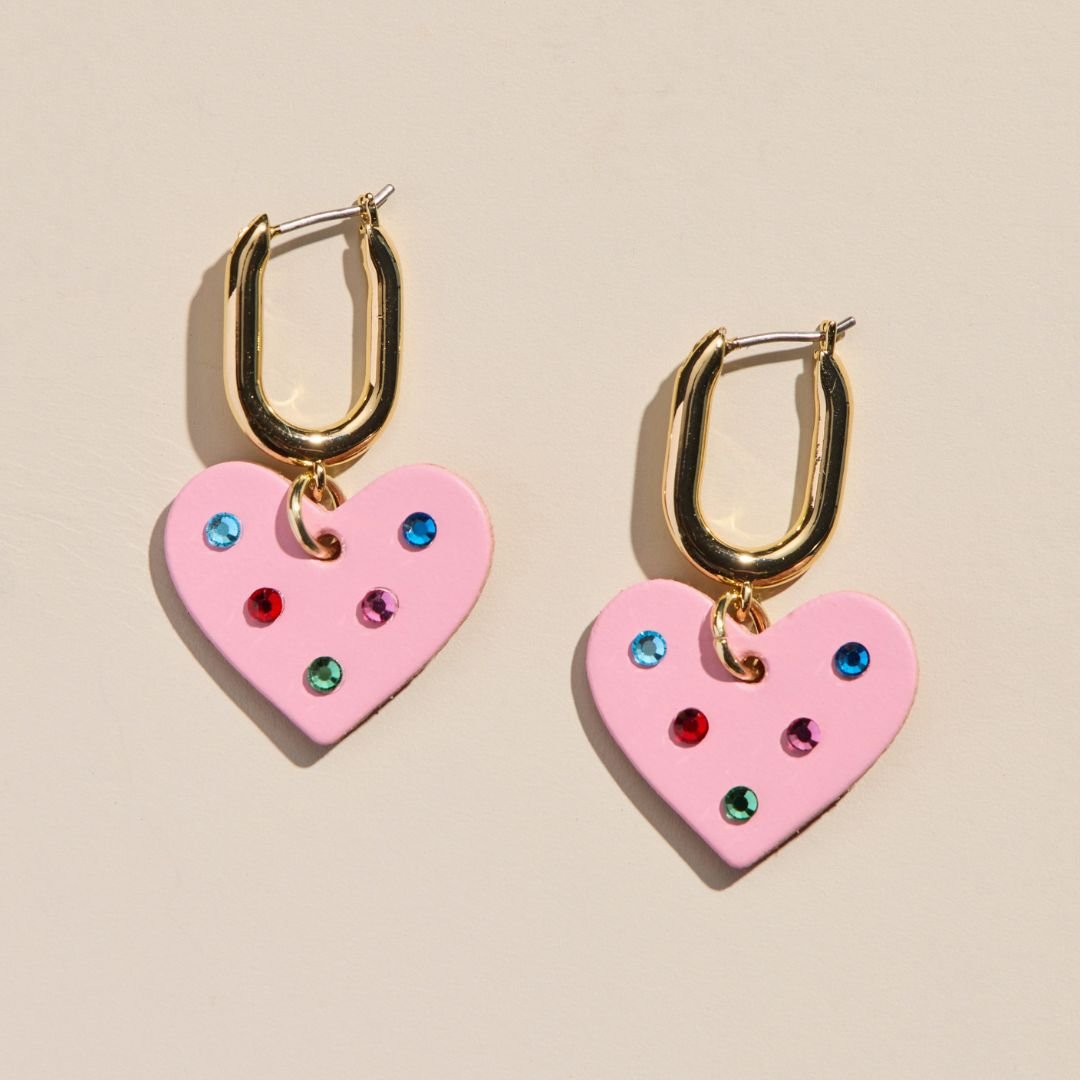 The Cameo Jeweled Quinn creates a bold statement, featuring a lightweight leather heart on a huggie earring with multicolor rhinestones applied by hand.