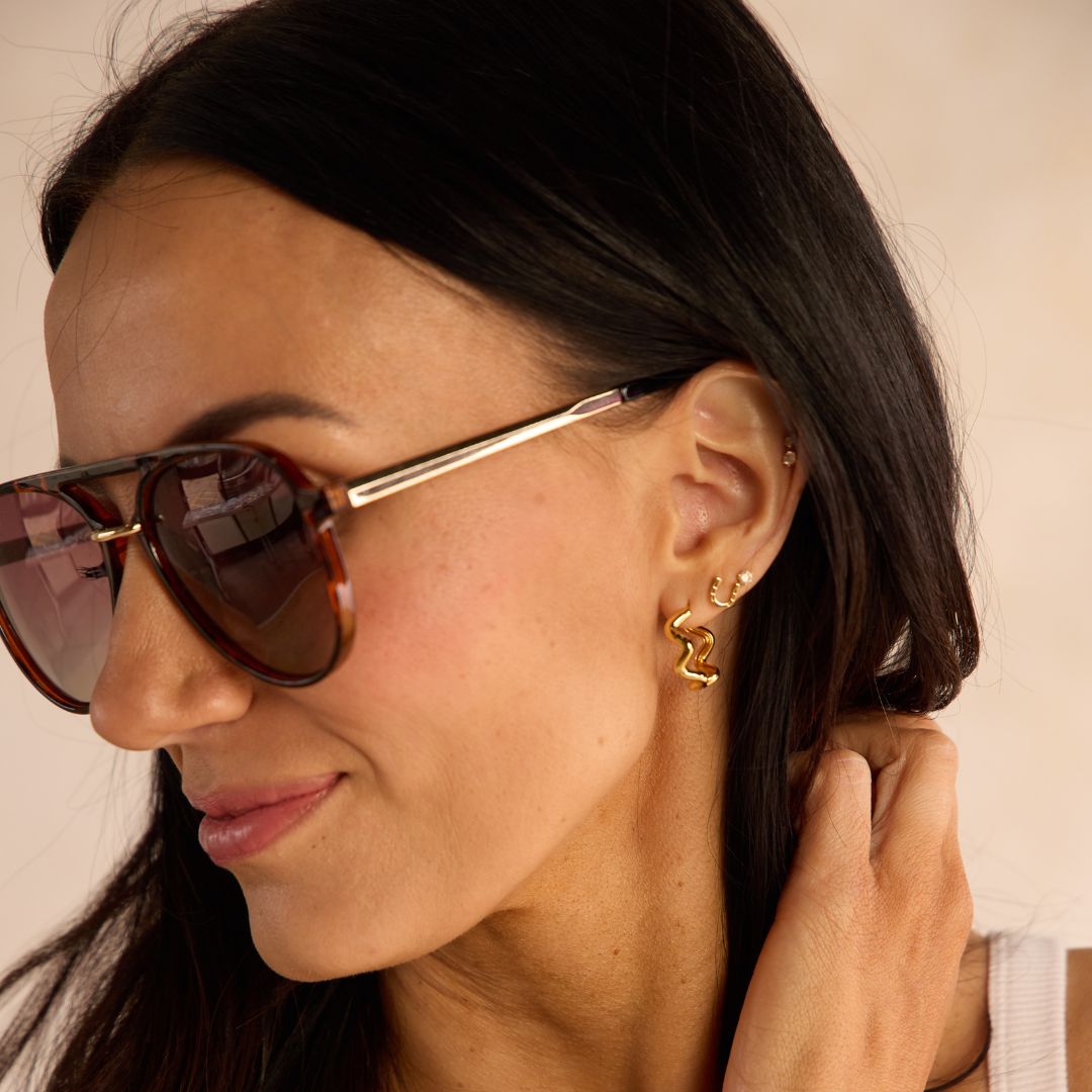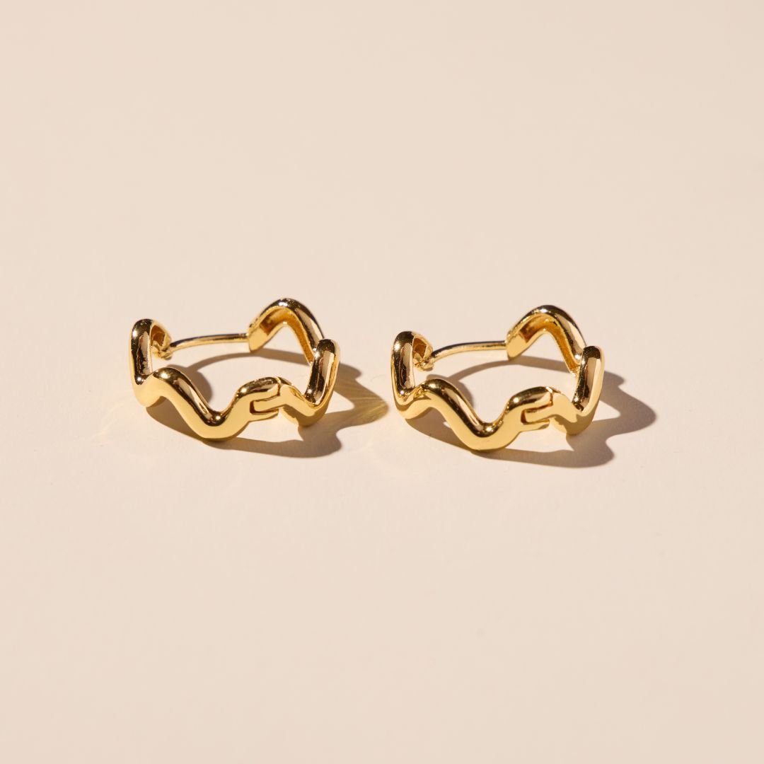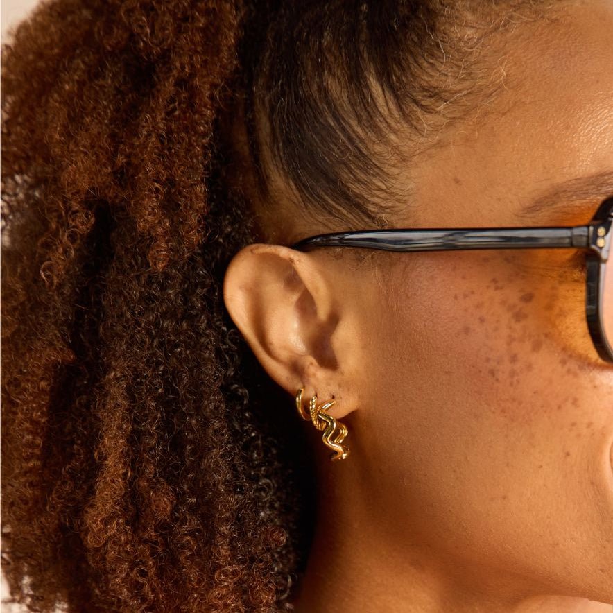 Add a fun statement to your everyday stack with the Gold Squiggle hoops. Featuring a wave-like design they bring a bold yet effortless touch to any look.Â