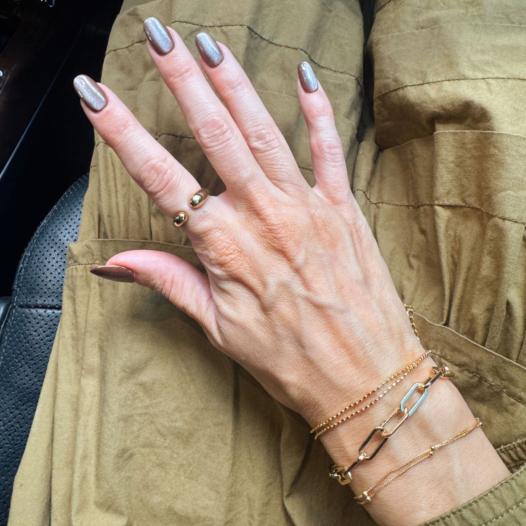 The Double Round Ended Ring features an adjustable, open-ended design with sleek round accents on each end. Made with durable PVD plating, it’s waterproof and perfect for everyday wear. Its modern, versatile style makes it ideal for stacking or wearing alone.