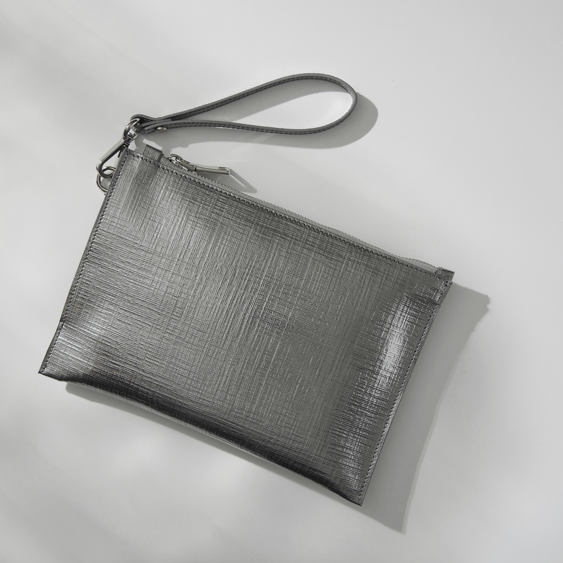 Meet the Etched Silver Prima - she's a vibrant wristlet handbag made out of our metallic textured Etched Silver leather. Premium Italian leather, made in Italy. Lined with a pink, satin lining that wipes clean easily.