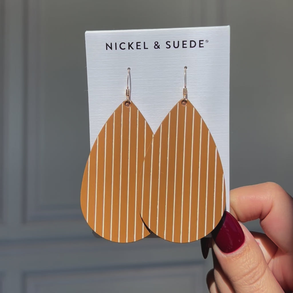 The London Tan Pinstripe Teardrop is a lightweight statement leather earring in our classic Teardrop shape. These earrings are made with premium London Tan leather accented with white pinstripes. This statement style adds a classic touch to any outfit.