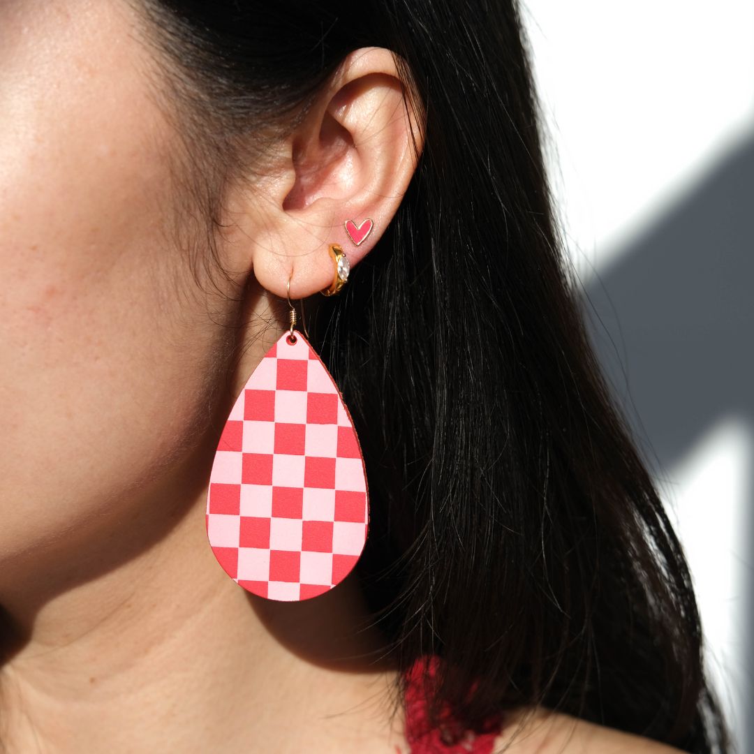 Crimson & Pink Checkmate Teardrops feature a foil checkered print against smooth, crimson leather. This style is available in a gold hardware option.