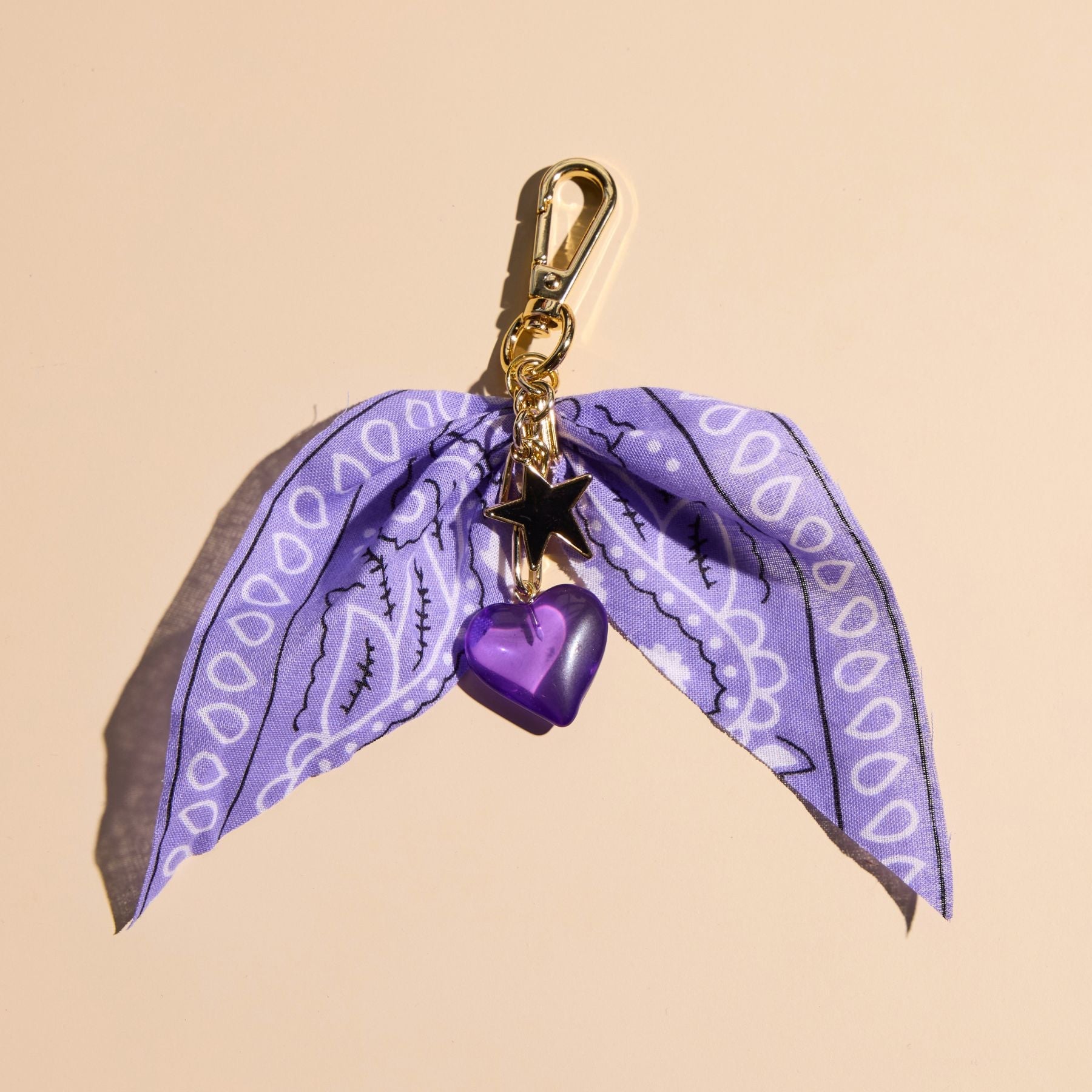 The perfect western accent to your everyday carry. The Lavender Bandana Bag Charm is crafted from soft bandana fabric finished with a small purple acrylic heart and black superstar charm. Clipping on effortlessly for a rodeo-ready touch to any tote, purse, or set of keys.