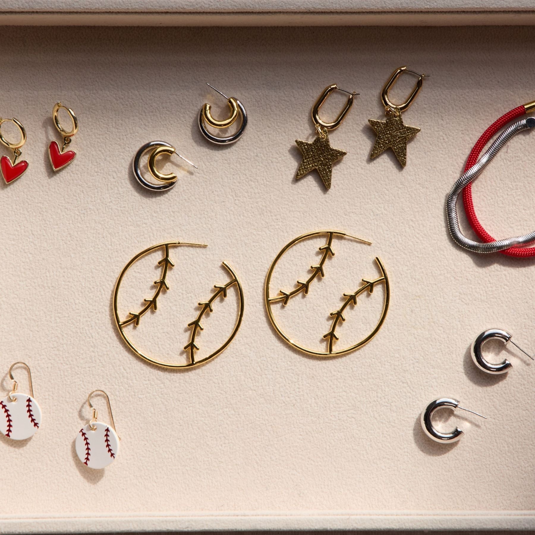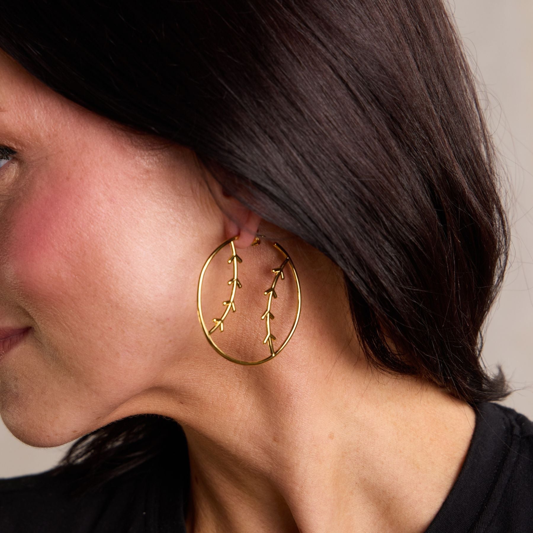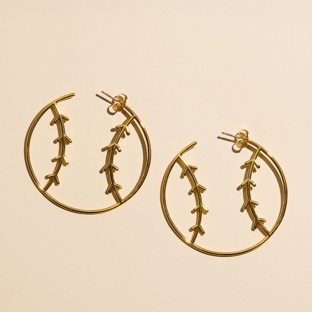 Elevate your gameday look with our baseball hoops - from the front they look like a thin hoop, but from the side they're sporty! Your choice of 14k gold plated or rhodium-plated silver.