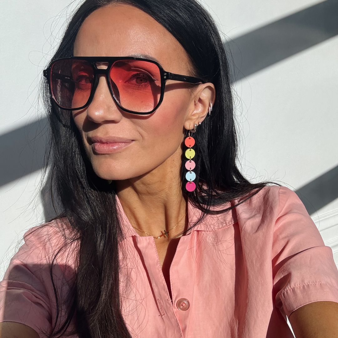 Made with a variety of our Sunrise, Chartreuse, Cameo, Robin, and Magenta Shimmer leathers, this lightweight asymmetrical earring has fun movement and color, allowing you to be unique and versatile with style.