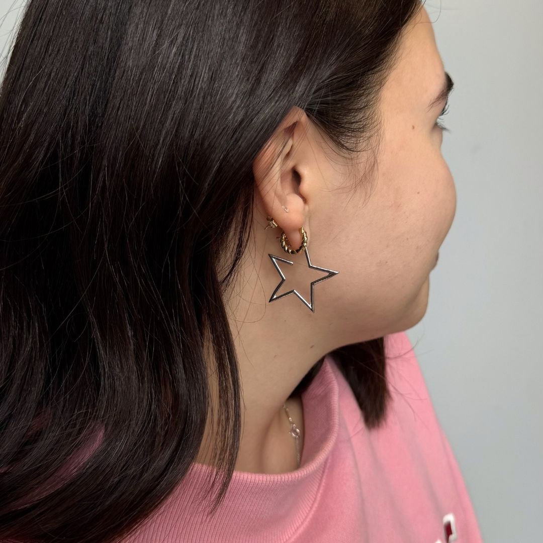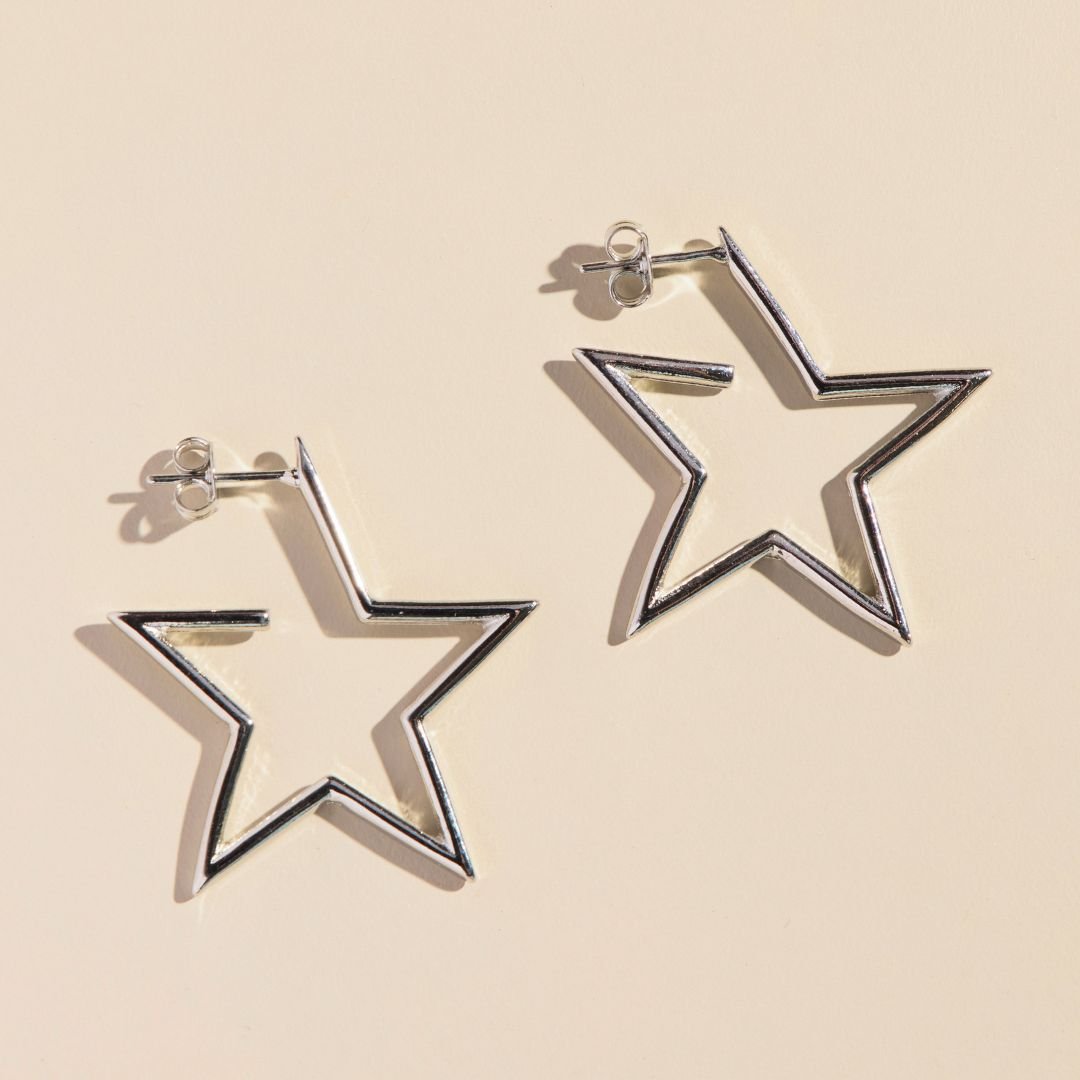 Make a statement with these star-shaped hoops that shine from every angle. Designed in a bold star silhouette with a sleek silver finish, they bring a playful twist to a classic hoop. Lightweight and easy to wear, they’re the perfect standout piece for everyday or a fun night-out look.