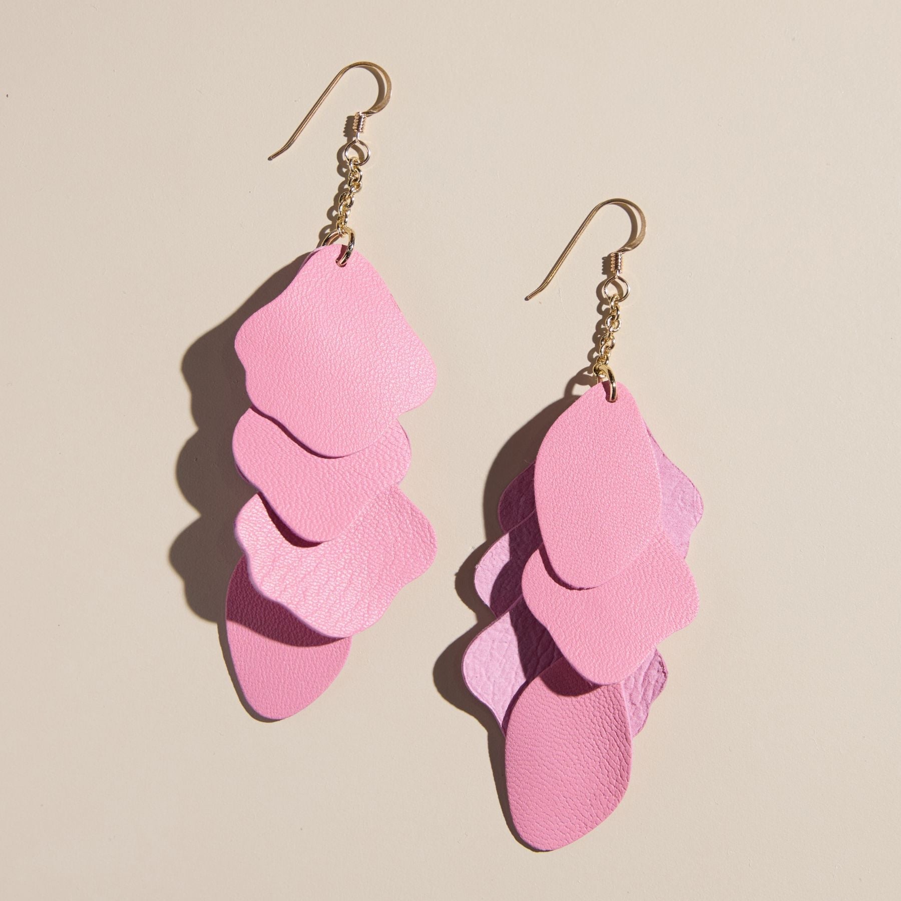 Florence is a statement earring designed to be incredibly soft with lots of volume and a subtle sway. Crafted with soft, Petunia leather attached to gold chains, this versatile piece will go with anything.