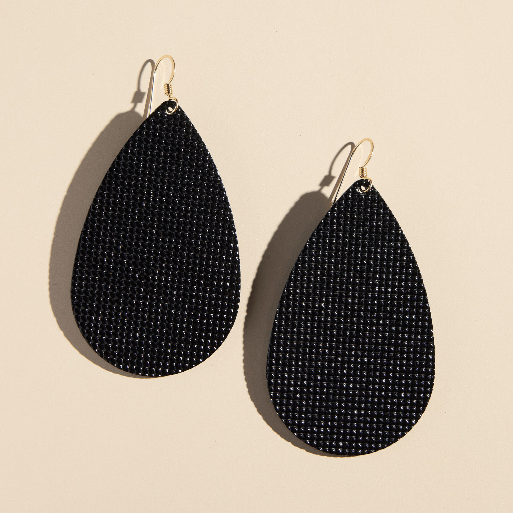 The shimmering texture of our Afterglow Teardrops offers a subtle shine to any outfit. This lightweight black leather is classic yet versatile, making these the perfect statement earrings for minimalists and enthusiasts alike.