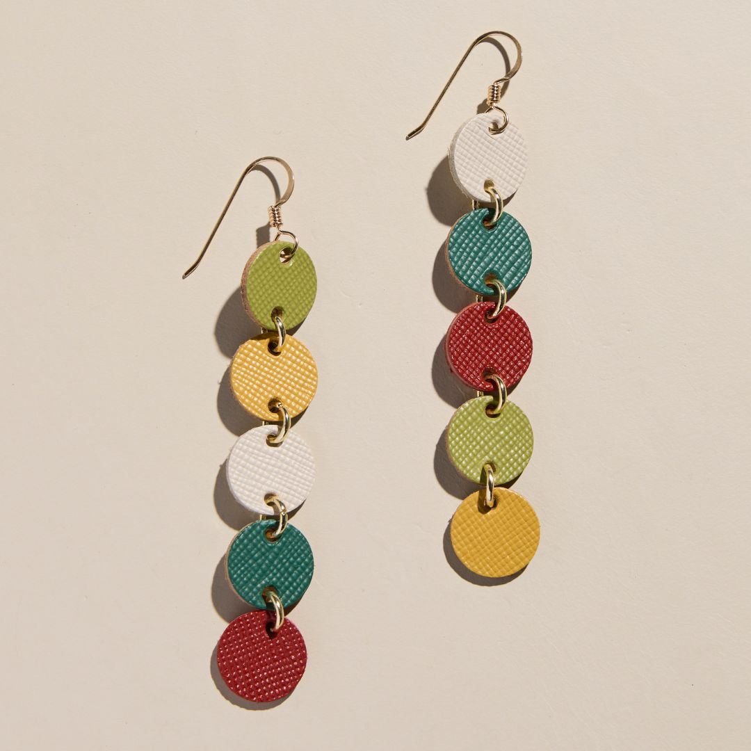 Made with a variety of our Marigold, Cactus, Auburn, Dark Green and Blank Canvas, the Autumn Harvest Sylvie is the perfect fall statement earring. This lightweight earring has fun movement and color, allowing you to be unique and versatile with style.