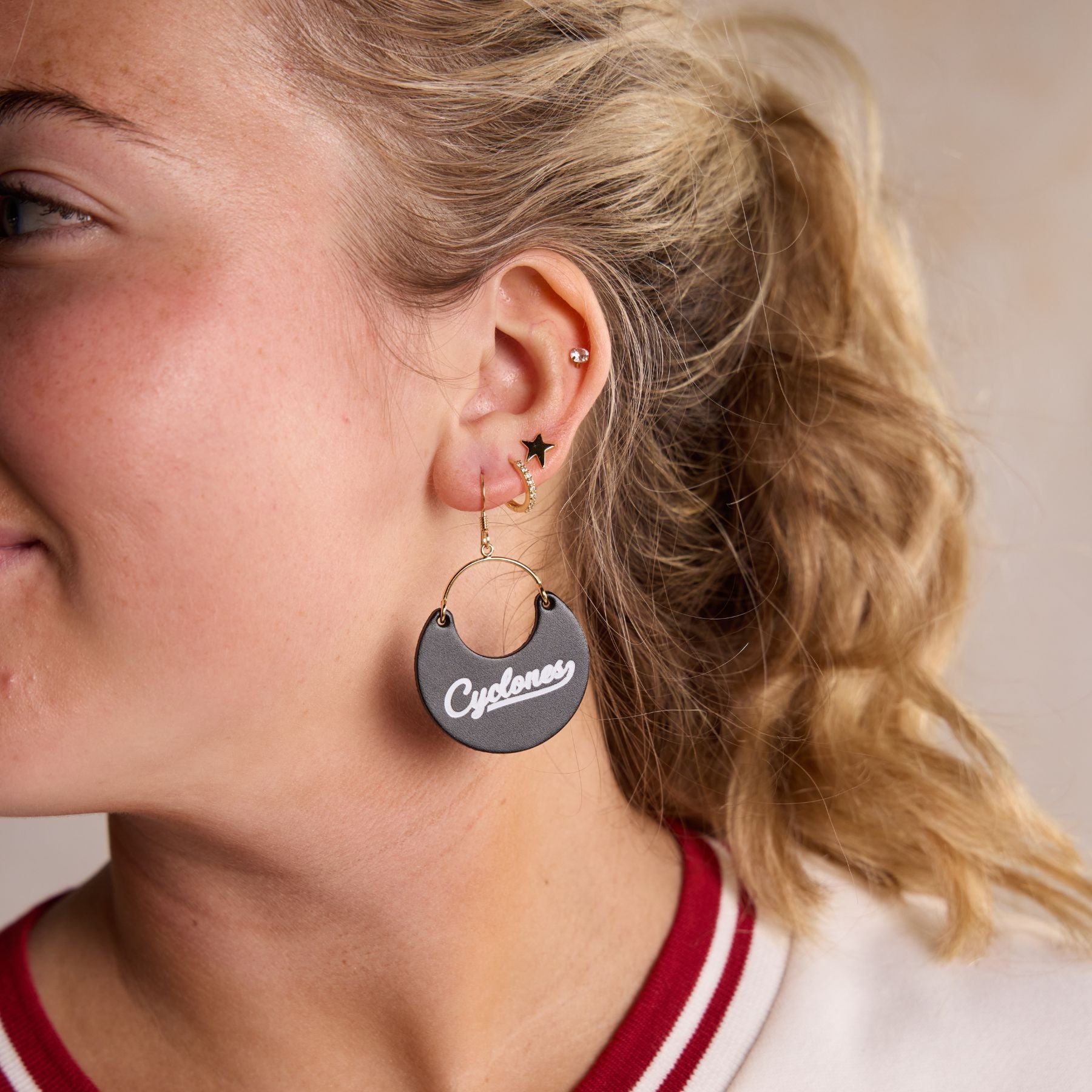 Elevate your Iowa State game day look with our Black Iowa State University Cyclones Script Ninas. A cute and chic game day earring that's perfect for showing off your team spirit in style.
