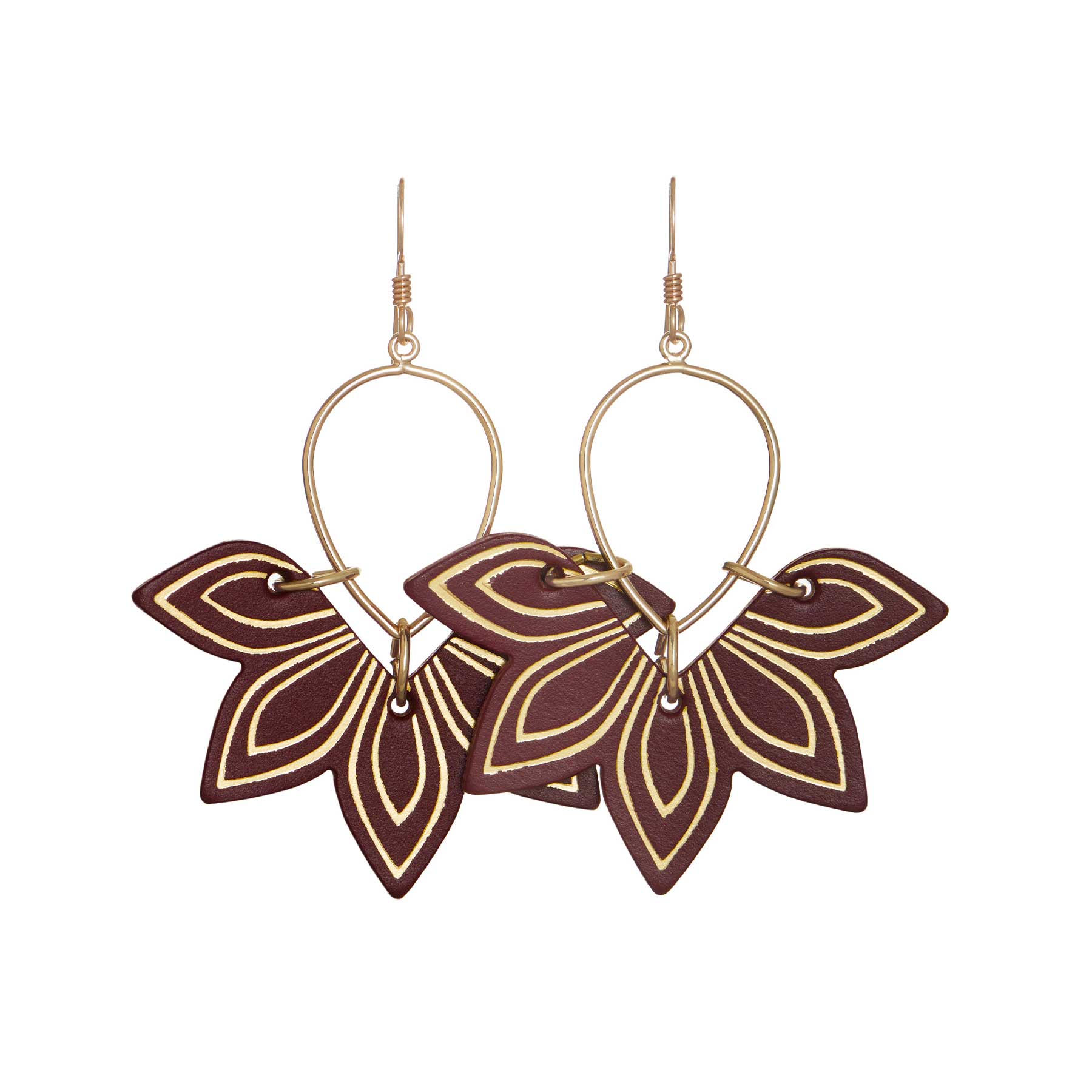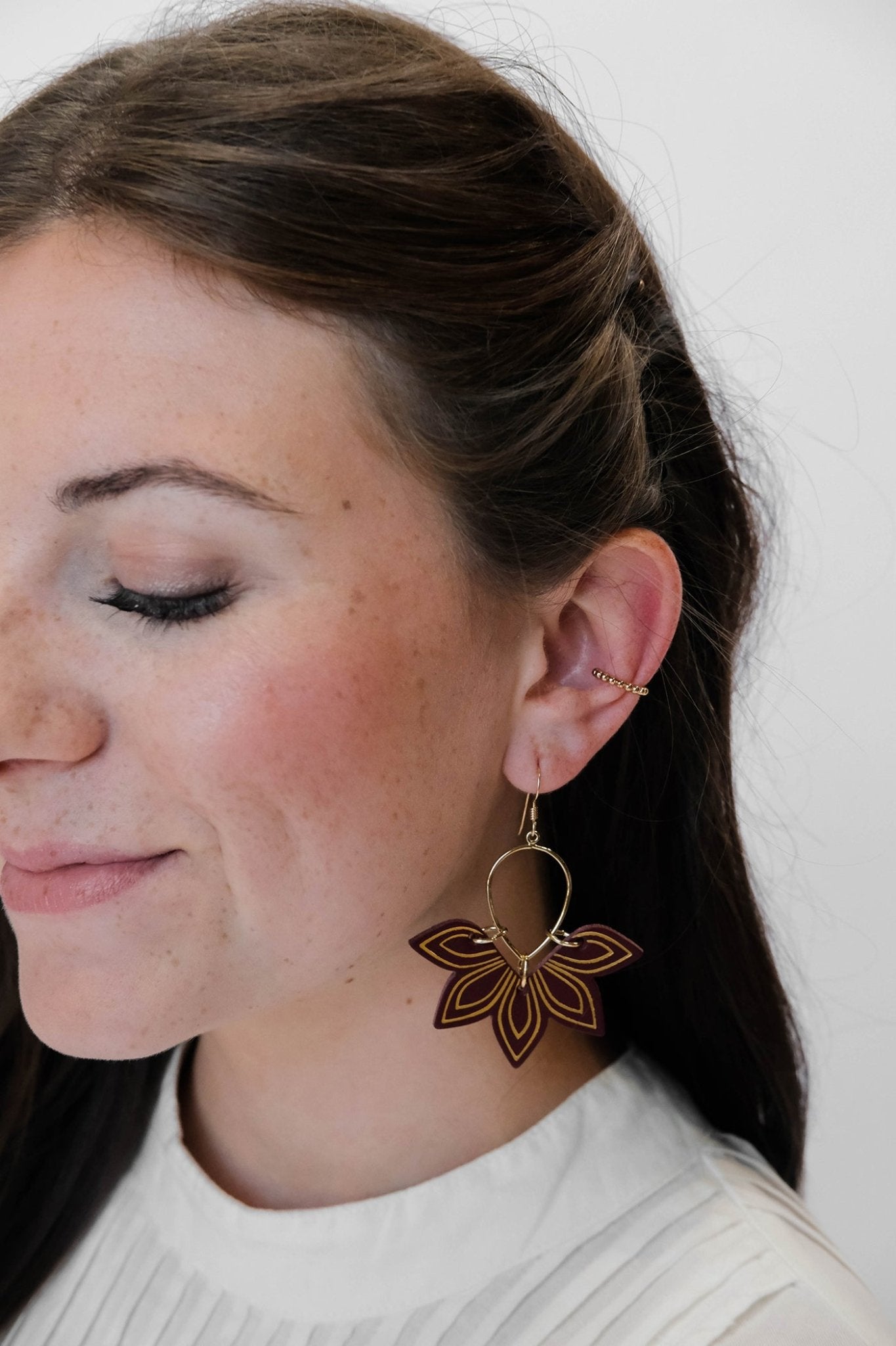 Floras are hoop statement earrings inspired by floral silhouettes. These lightweight earrings feature a petal-shaped accent made with luxe firm leather, hand-embossed with our newest gold foil design.
