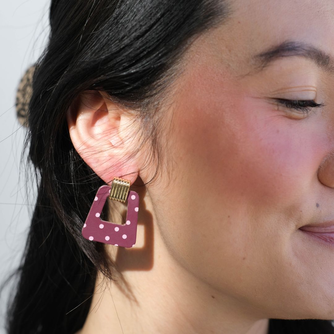 Timeless style meets a modern silhouette with the Avery earrings. This lightweight statement earring is created with our premium firm burgundy leather, embossed with cameo polka dots. Finished with a gold or silver stud component.