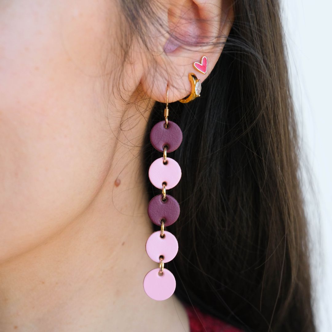 This asymmetrical design is made with a variety of our Cameo and Burgundy leathers. This statement earring has fun movement allowing you to be unique and versatile with style.