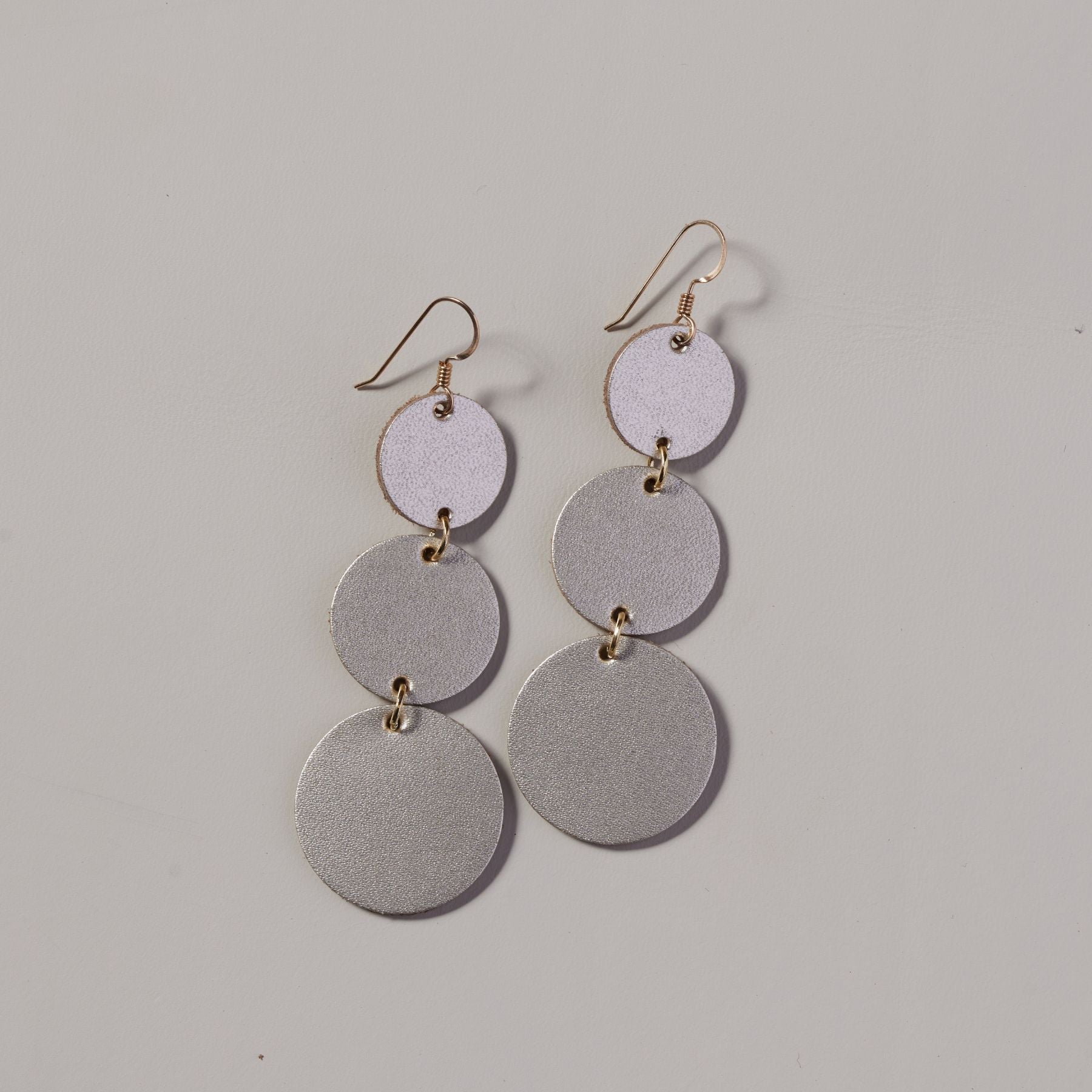 Dotties feature a signature three-piece silhouette in shimmering Champagne Satin leather. These earrings are the perfect lightweight, bold statement.