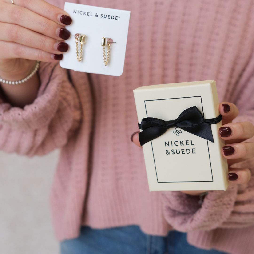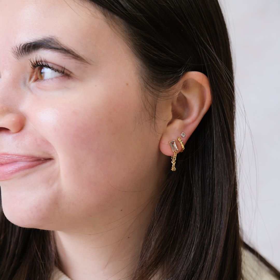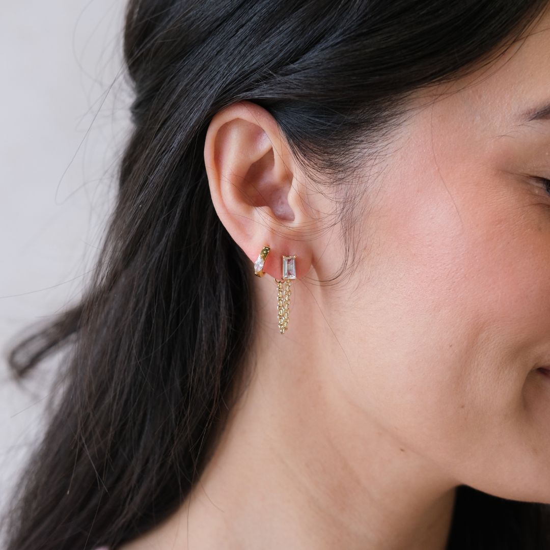 The Classic Baguette Chain Drop Studs are perfect for the second or third piercing to create a layered statement. With a baguette glass stone and 14k gold plated drop chain, this beautiful stud will complete the ultimate ear stack.