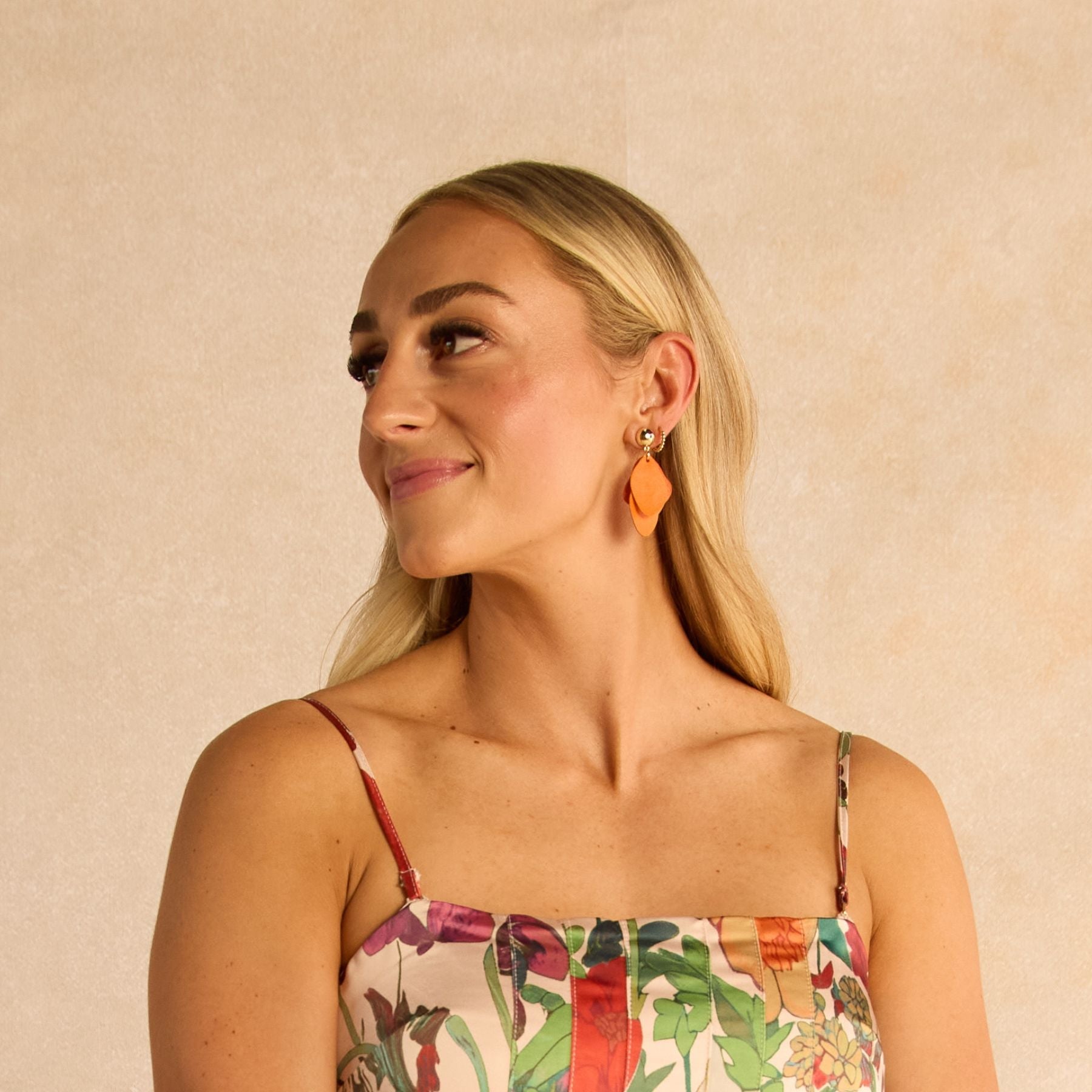 A new take on leather earrings, introducing the Weston. Crafted with soft Clementine Leather and gold or silver stud piece. These statement stud earrings are a one-of-a-kind, free-flowing leather earring, with subtle movement and lightweight design.