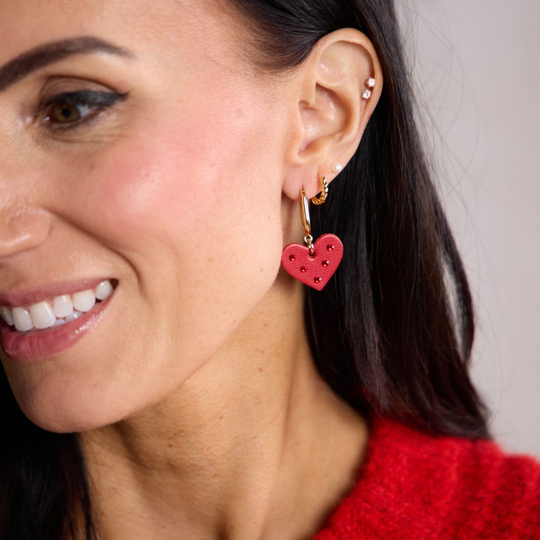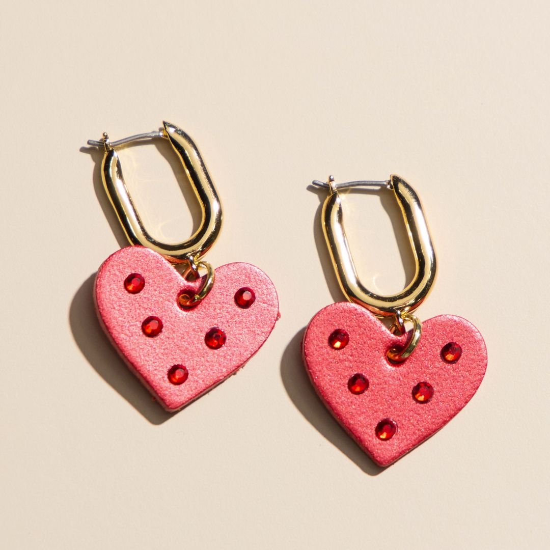 The Crimson Shimmer Jeweled Quinns create a bold statement, featuring a lightweight leather heart on a huggie earring with a red rhinestones applied by hand.