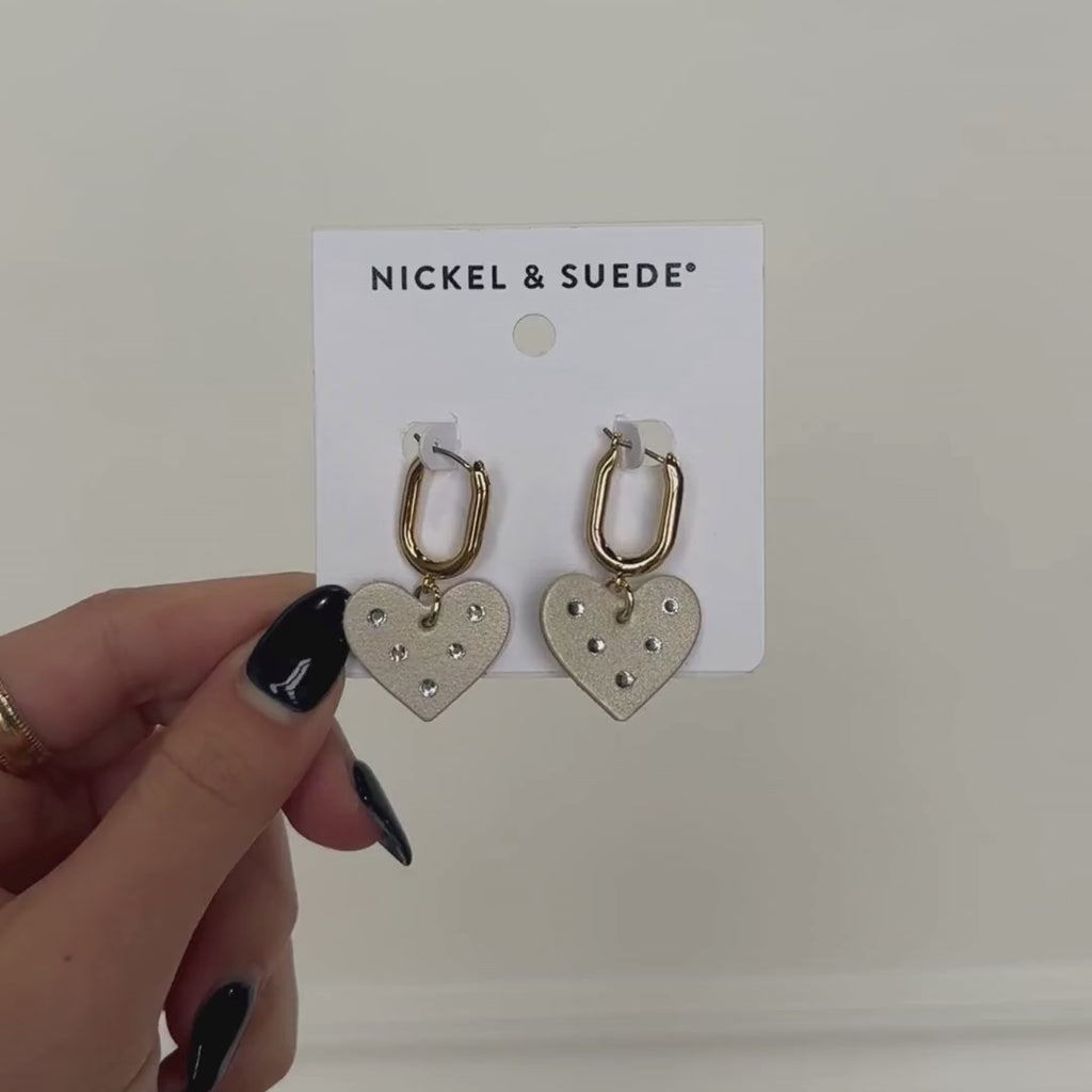 The Frosted Pearl Jeweled Quinn creates a bold statement, featuring a lightweight leather heart on a huggie earring with rhinestones applied by hand.