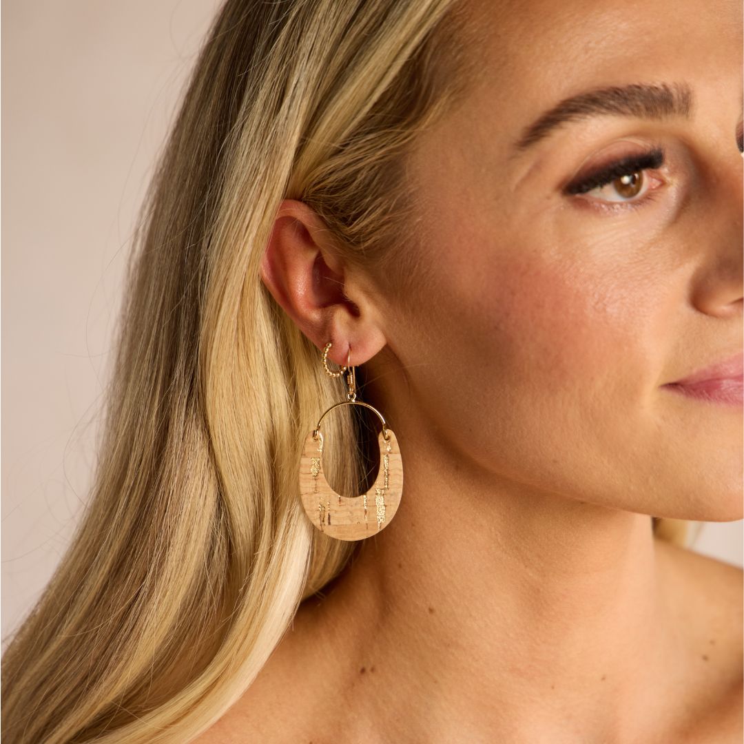This lightweight statement earring is created with our favorite Gold Cork leather. These earrings have a textured cork front speckled with gold leaf and a smooth tan leather back. The Gold Cork Nadias are the perfect addition to any summer outfit.