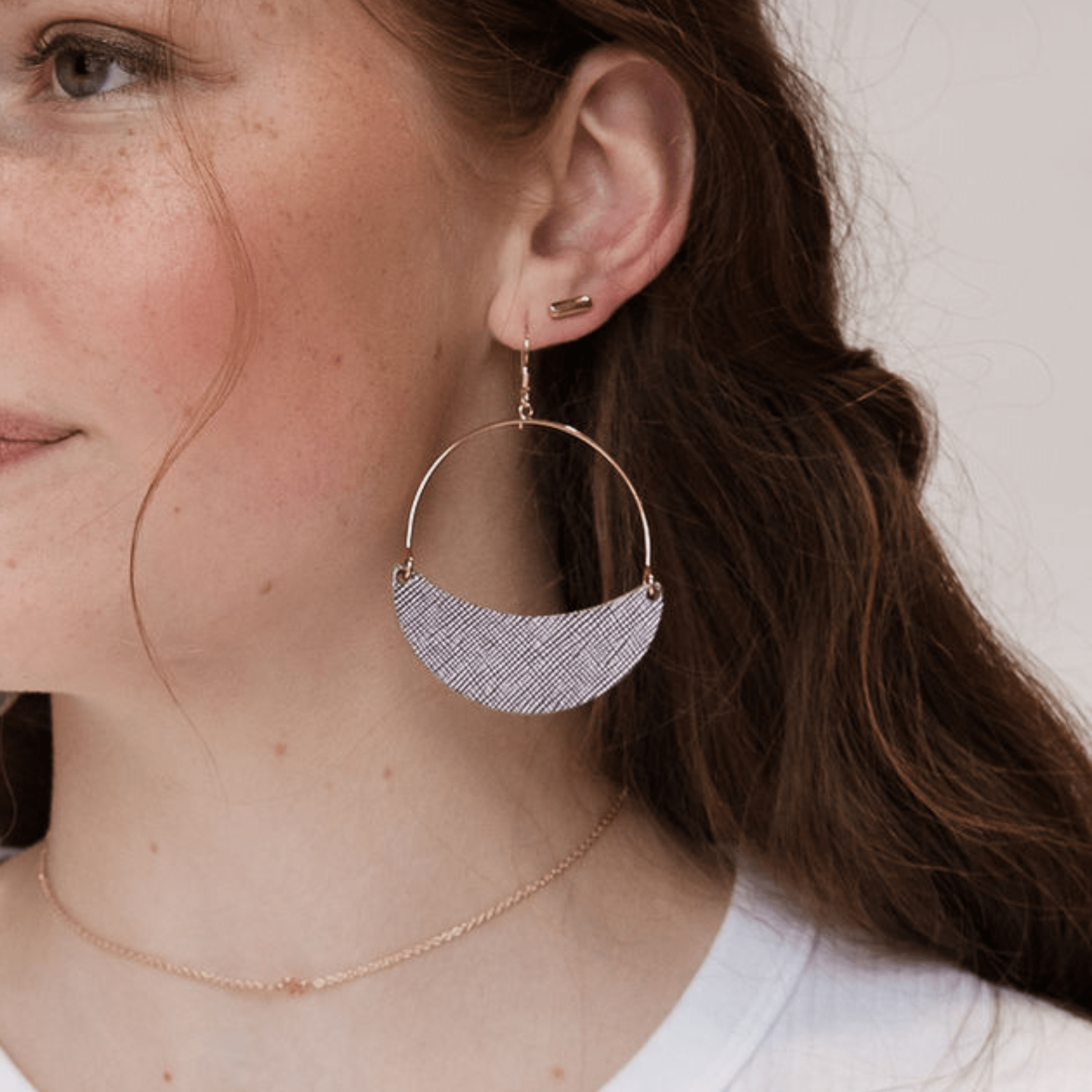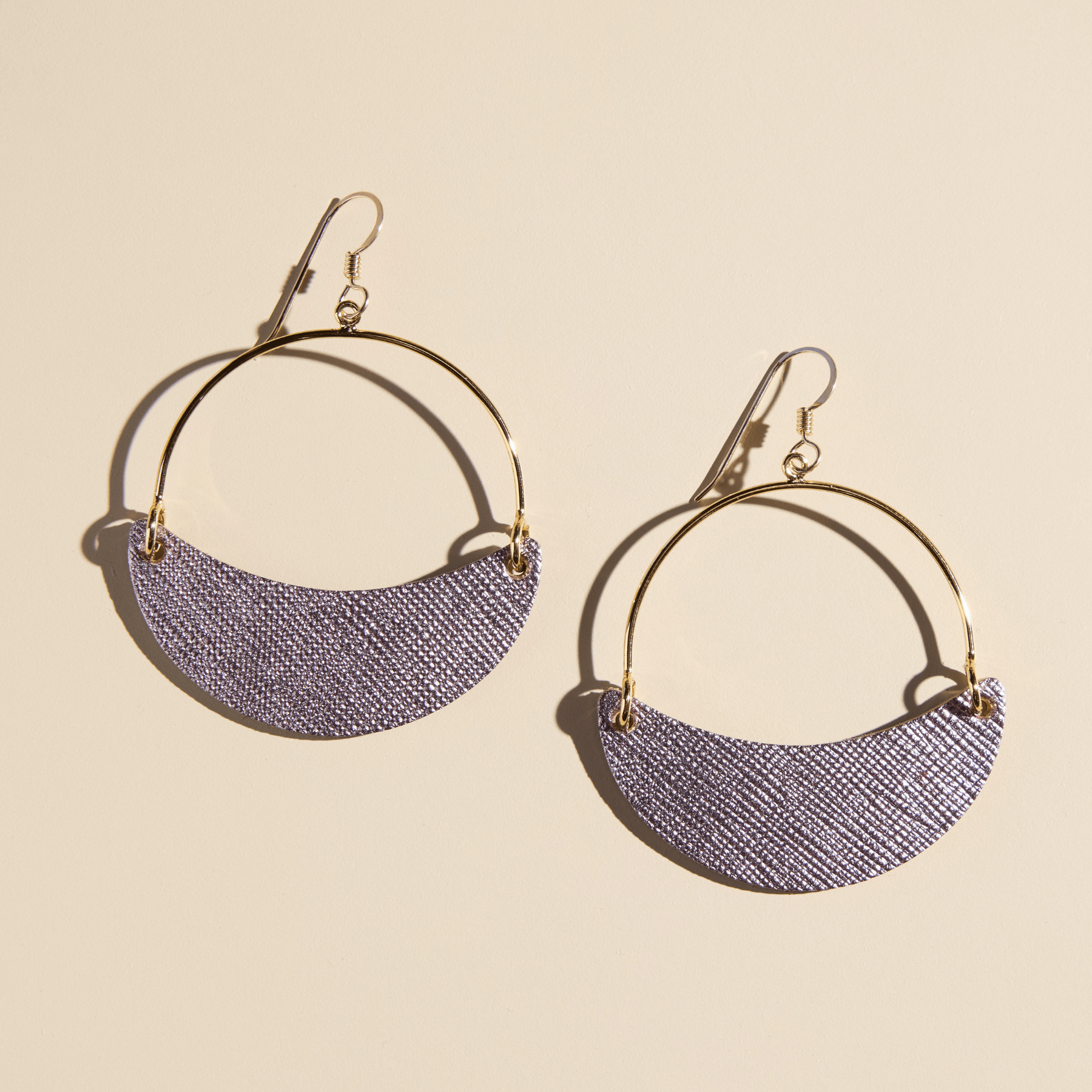 Asters are a lightweight take on the classic hoop earring with a crescent leather accent. This style is crafted from premium textured lavender leather, with a slight swinging movement and versatile wear-everywhere style.