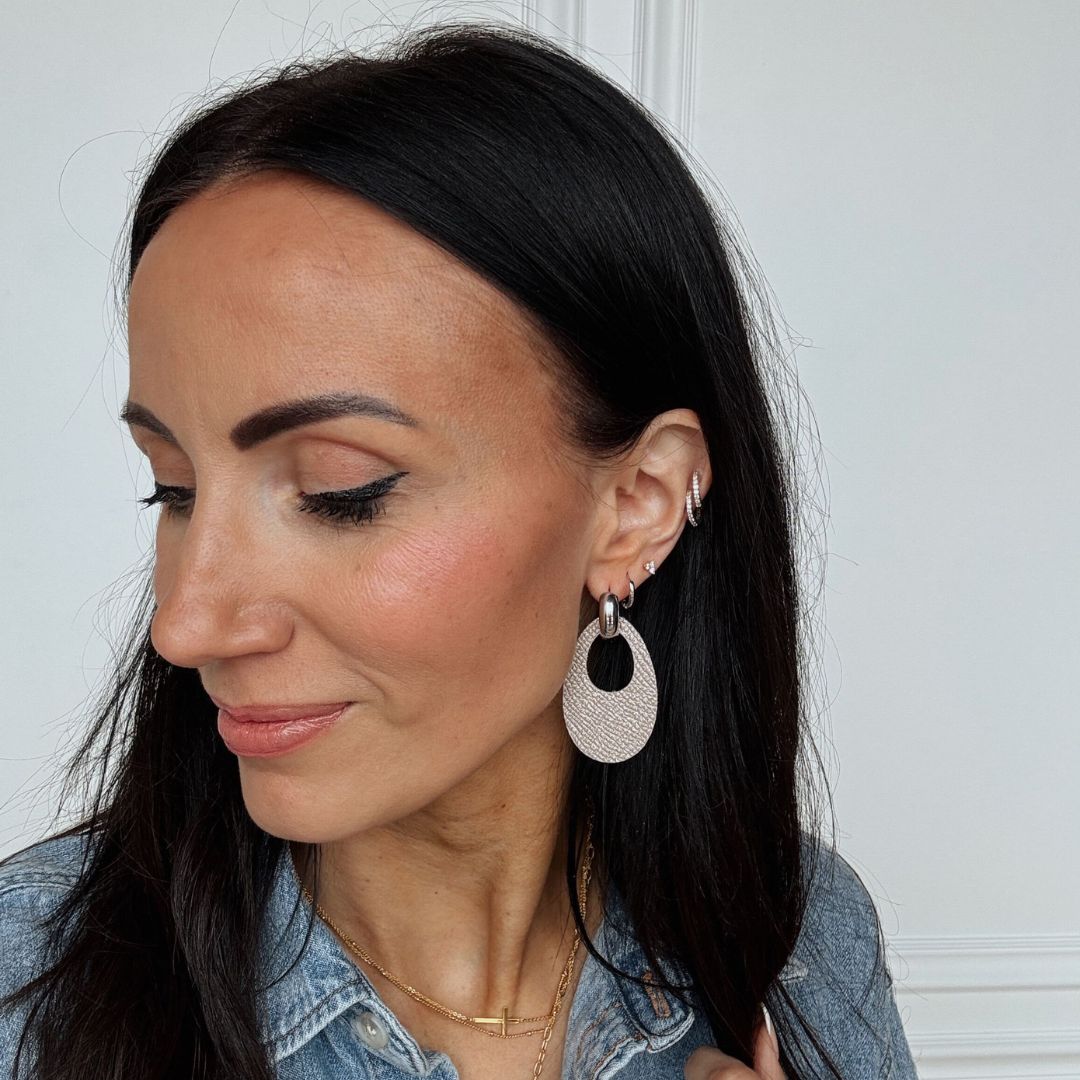 A new take on the classic statement earring. Featuring an oval drop with a subtle cut-out center, it creates a modern, sculptural look that feels both bold and effortlessly refined. Finished with a polished gold or silver huggie.