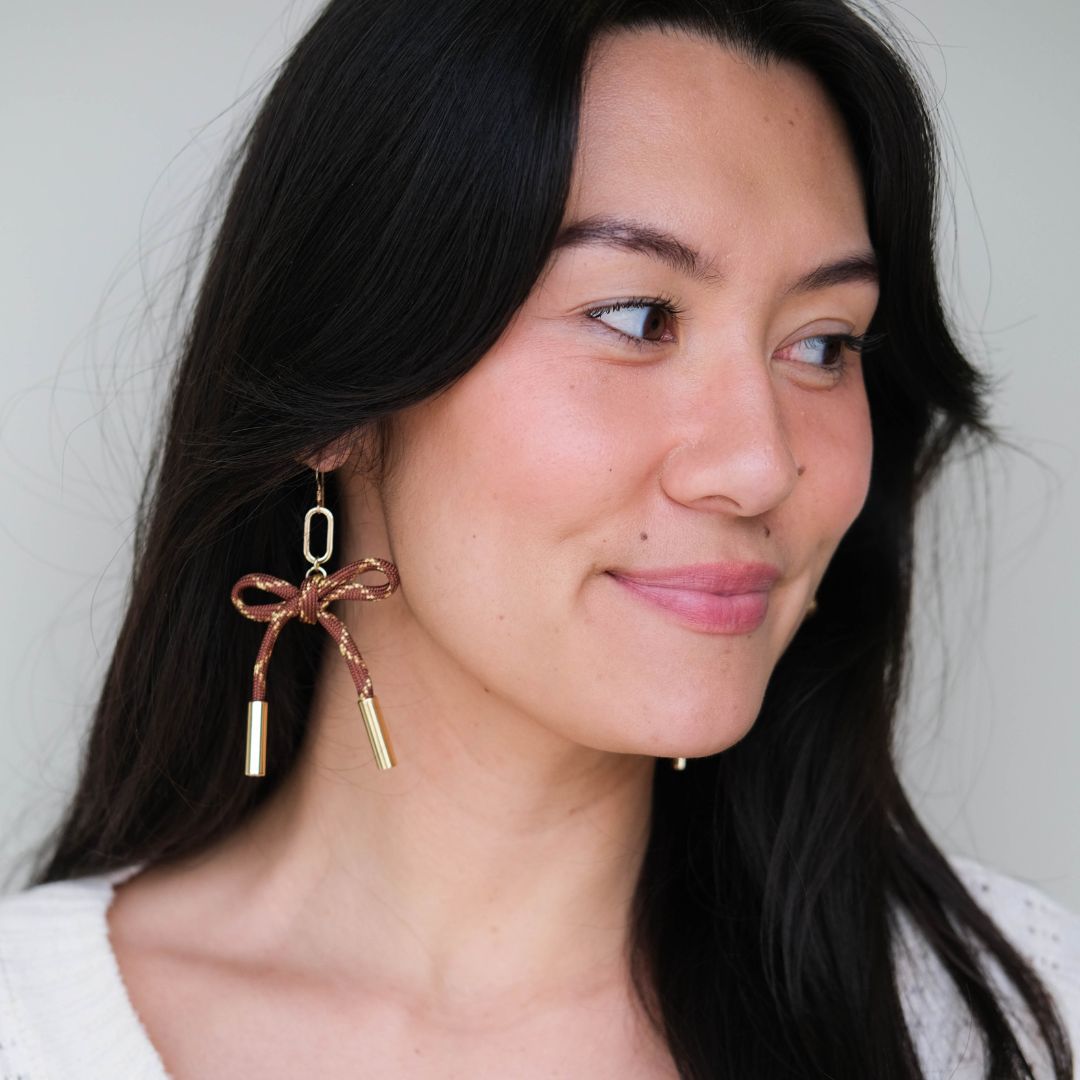 Meet Metallic Chocolate Simone. Crafted from lightweight nylon paracord and finished with your choice of 14k gold-filled or rhodium-plated sterling silver hooks, this statement earring is made to stand out for the Holidays.