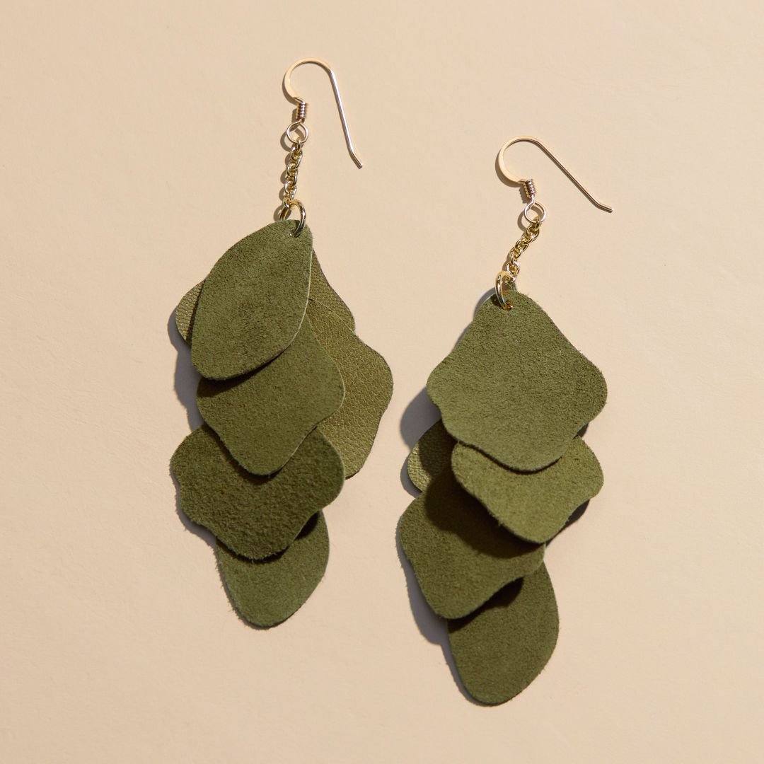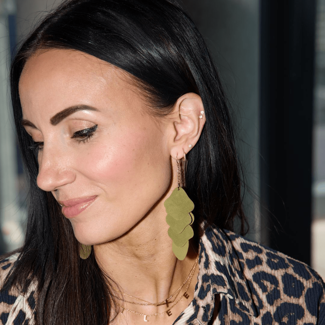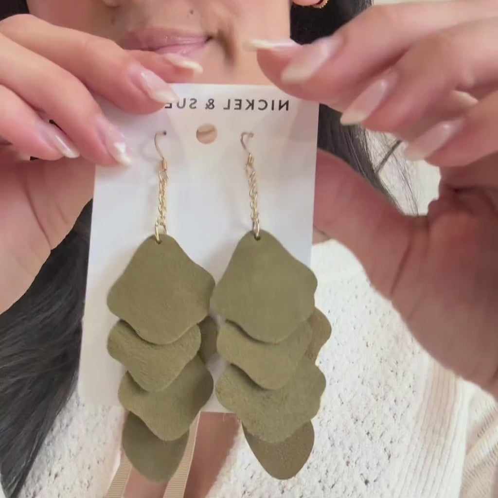 This layered statement earring is designed to be incredibly soft with lots of volume and a subtle sway. Crafted with luxe olive nappa suede attached to chains, this versatile piece will go with anything.