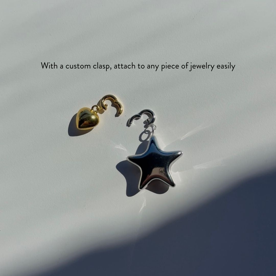 Add a unique touch to any bracelet, necklace or earring with the Puffy Heart Charm. Customize with with your favorite piece of jewelry, like a huggie hoop or bracelet, with a simple clasp that opens and closes with ease.