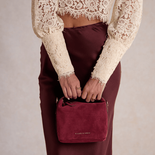 The Brigitte Suede Mini Bag is crafted from genuine Italian suede and is silicone-treated for water and stain repellency. Made with rich sangria-toned suede, its smooth, luxurious texture, luxe finishing touches and versatile size is perfect for any occasion.