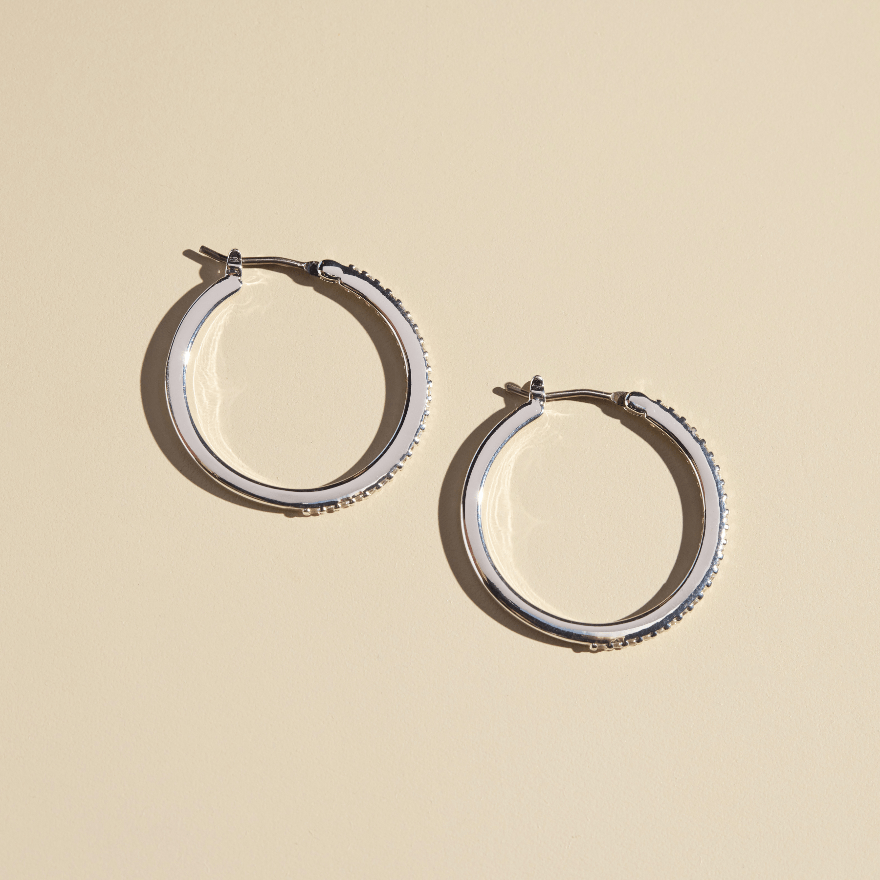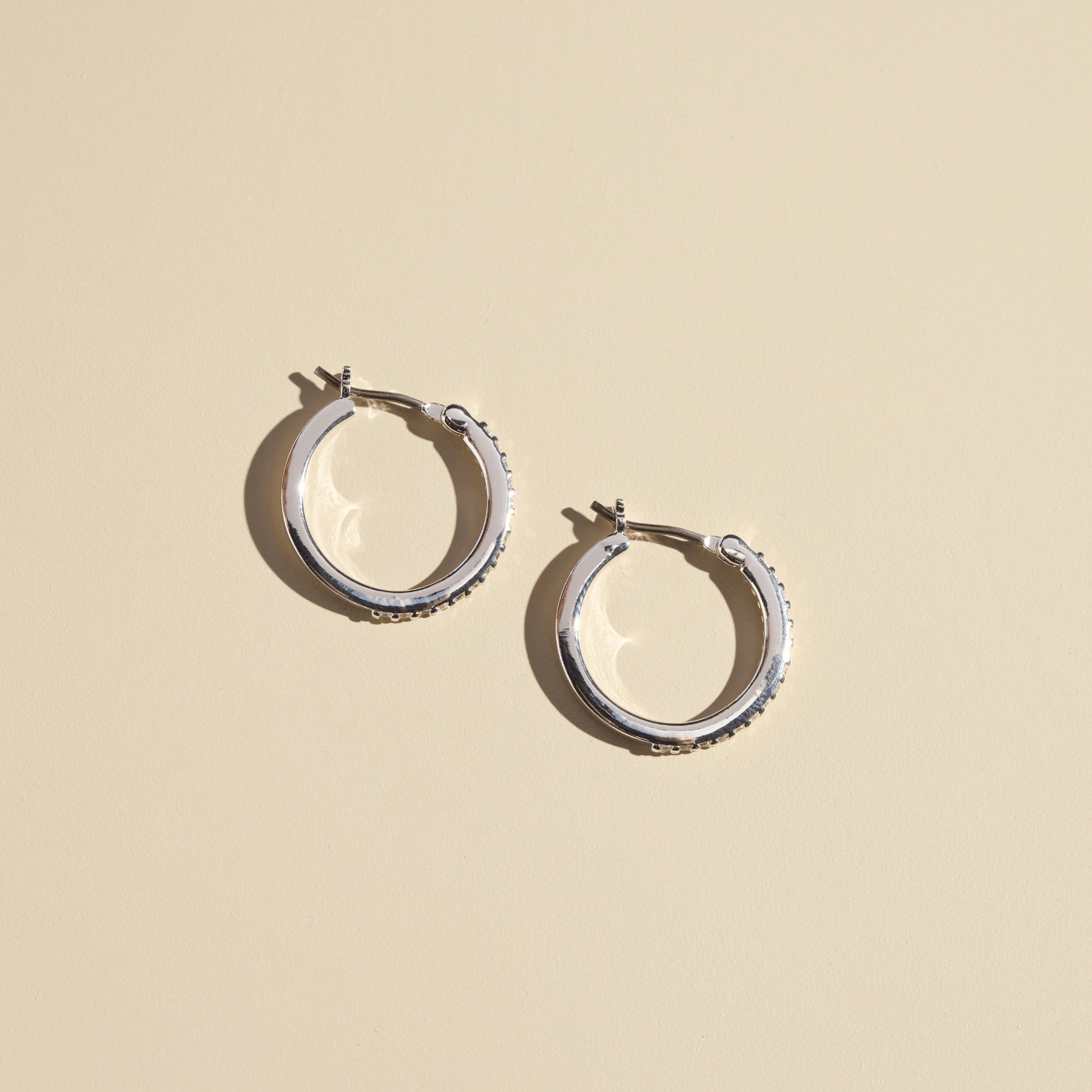 The Silver Pavé hoops are available in two different sizes 18mm or 25mm. Our Silver Pavé Hoops feature a pavé Cubic Zirconia to add an effortless bejeweled accent to any look.