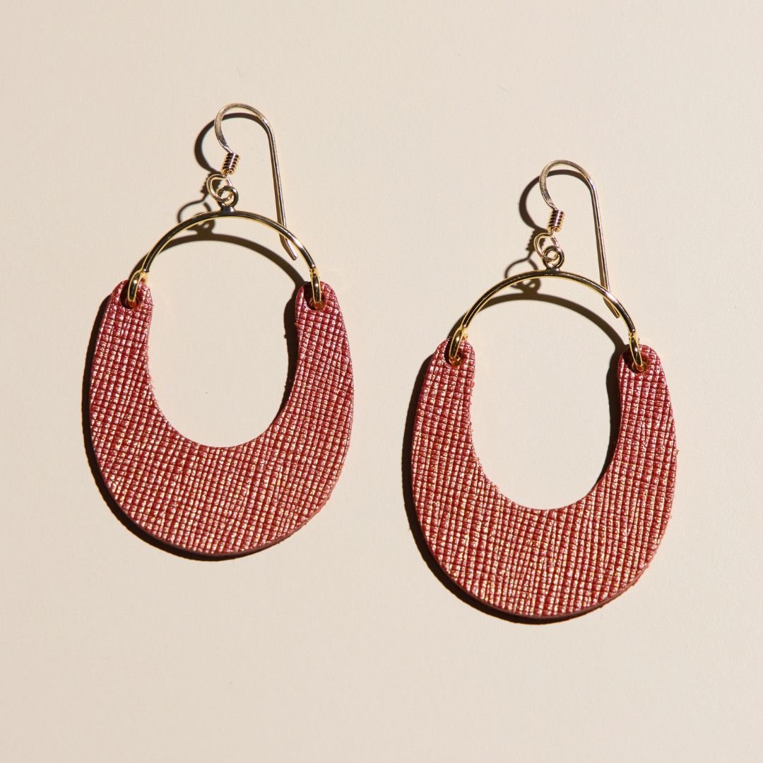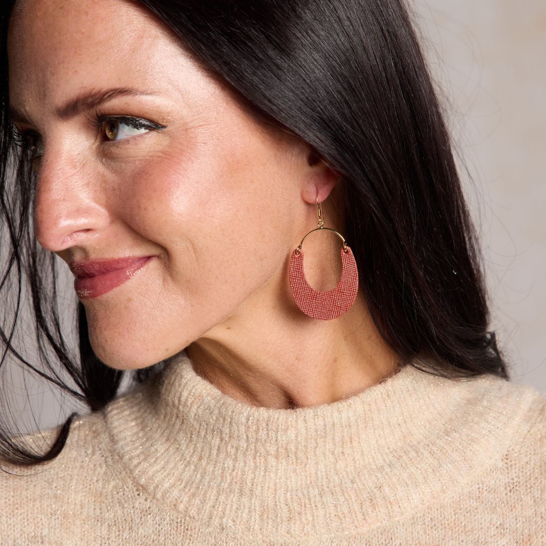 Make a statement with the Spiced Cider Nadia, made with Auburn leather with your choice of gold or silver hardware. These modern, lightweight earrings elevate any outfit.