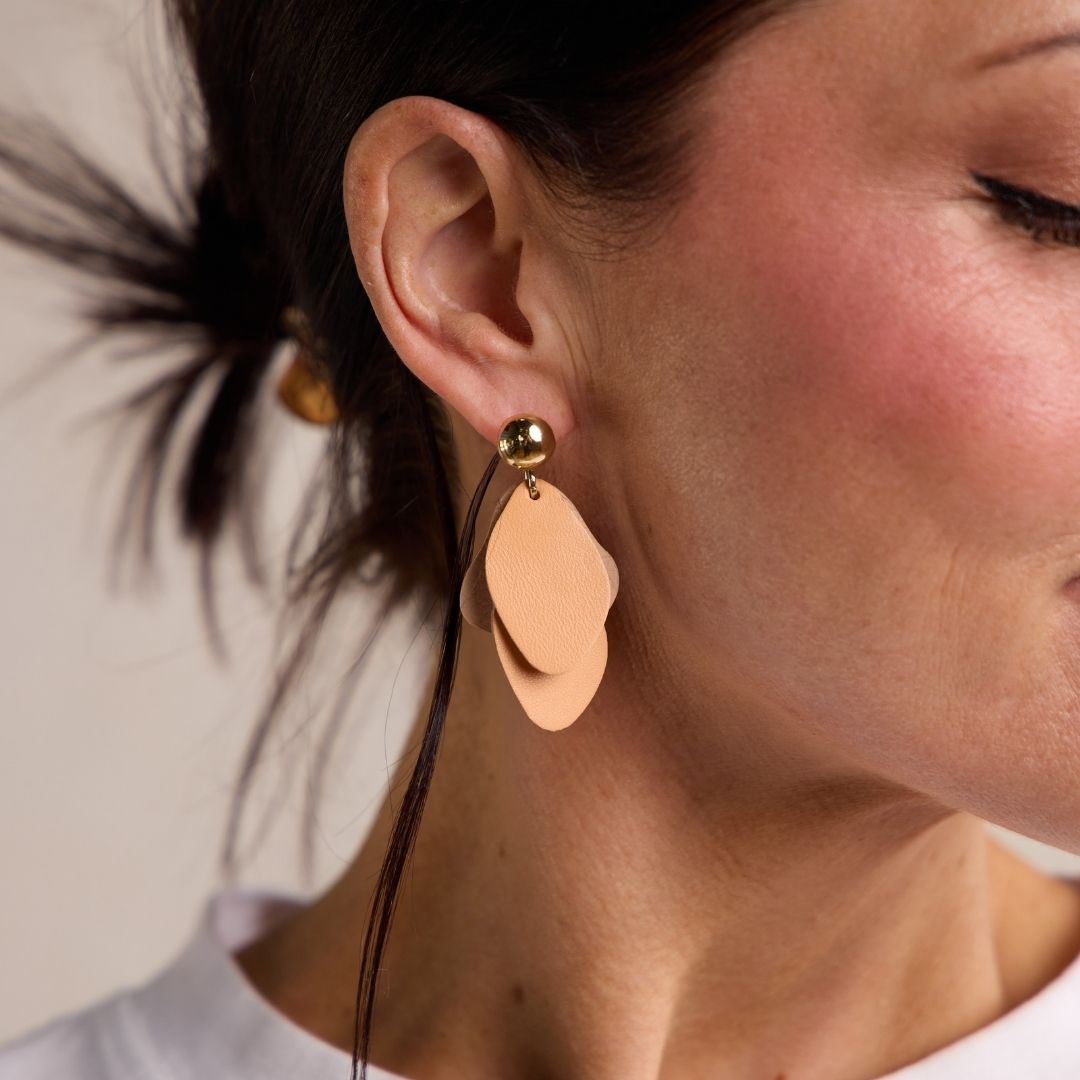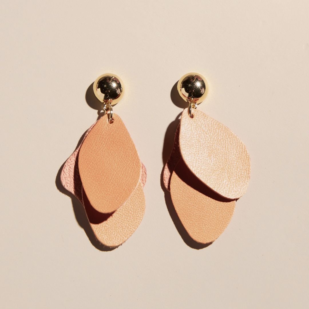 A new take on leather earrings, introducing the Weston. Crafted with soft Sugar Peach leather and gold or silver stud piece. These statement stud earrings are a one-of-a-kind, free-flowing leather earring, with subtle movement and lightweight design.