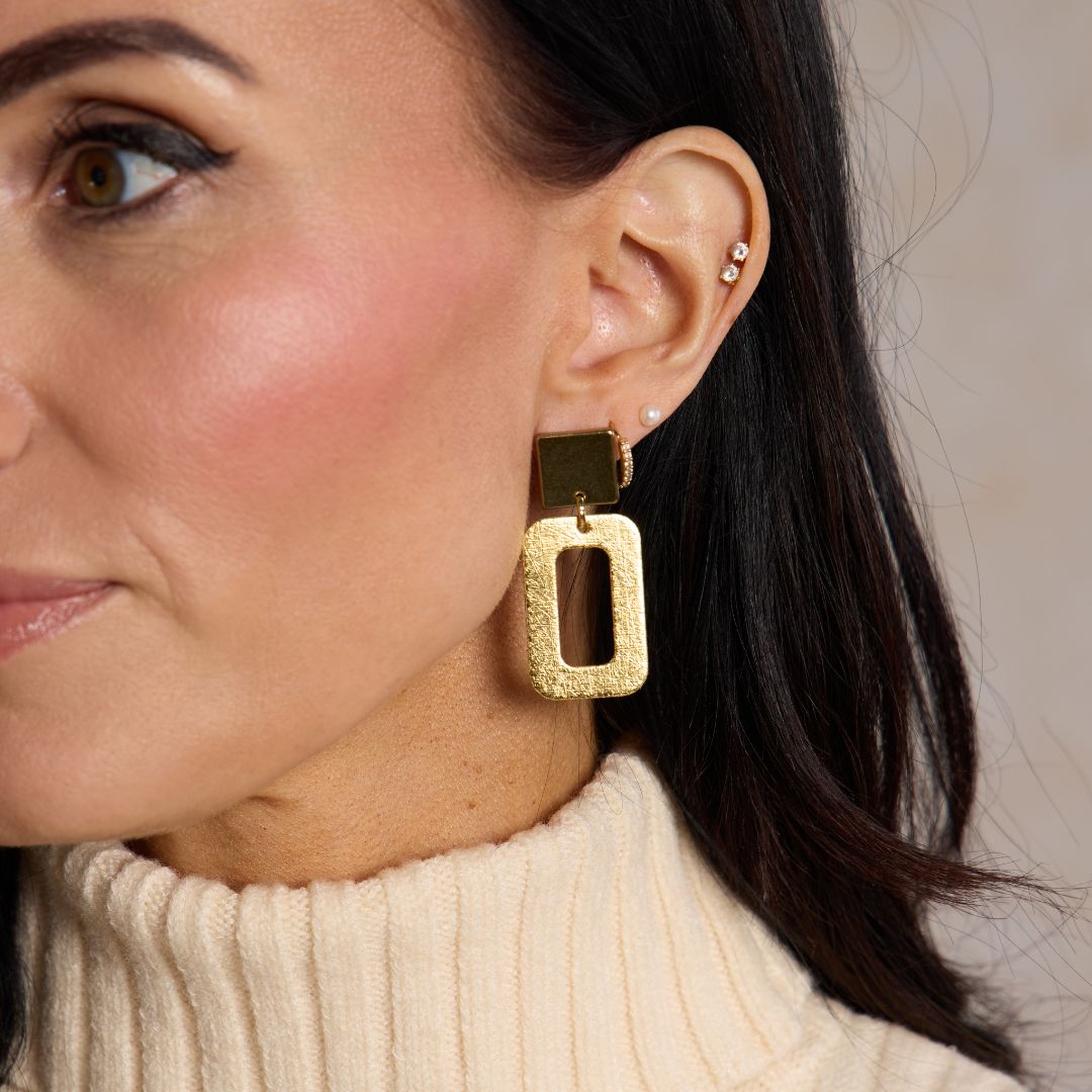 Make a modern statement with the Logan, featuring a soft rectangular leather drop in vintage gold paired with a sleek stud. These earrings bring effortless sophistication to any look. Lightweight and versatile for everyday wear or an elevated night out.
