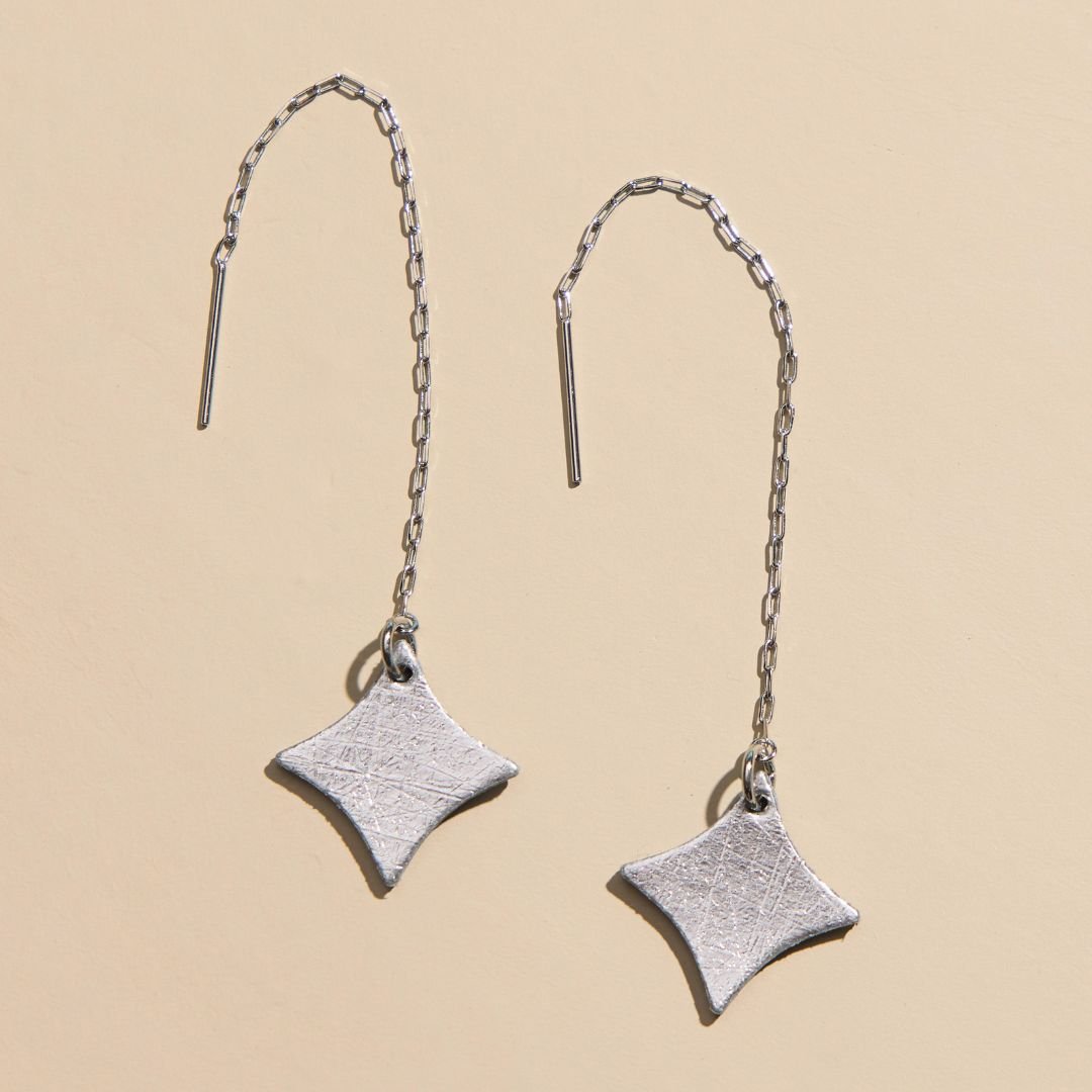 This design features a sparkle shaped leather accent attached to a rhodium-plated threader earring. The shimmering textured Vintage Silver leather adds an element of style to your daily look. Easily thread through any piercing for lightweight, no-slip wear.